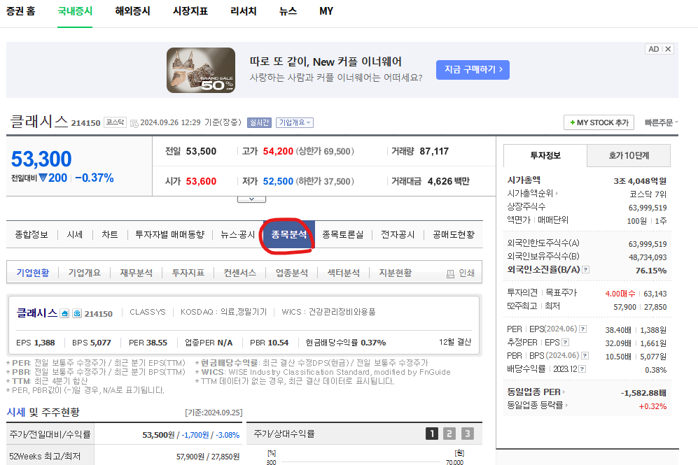 2. '클래시스' 라는 기업을 네이버 증권에 쳐서 정보를 확인합니다.