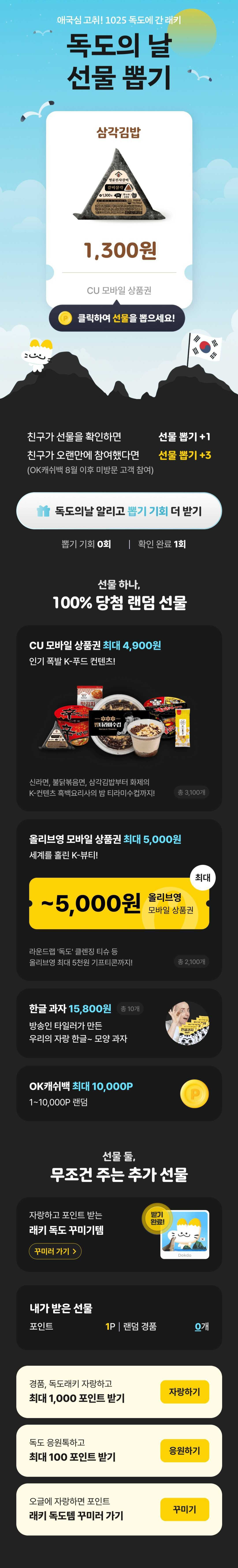 작성자기능재부 작성시간 24.10.30 ♥독도의 날 선물뽑기♥ 흑백요리사 밤티라미수컵, 올리브영 상품권, 방송인 타일러의 한글과자까지! 독도의날 공유하고 100% 당첨 선물 계속 뽑으세요~!