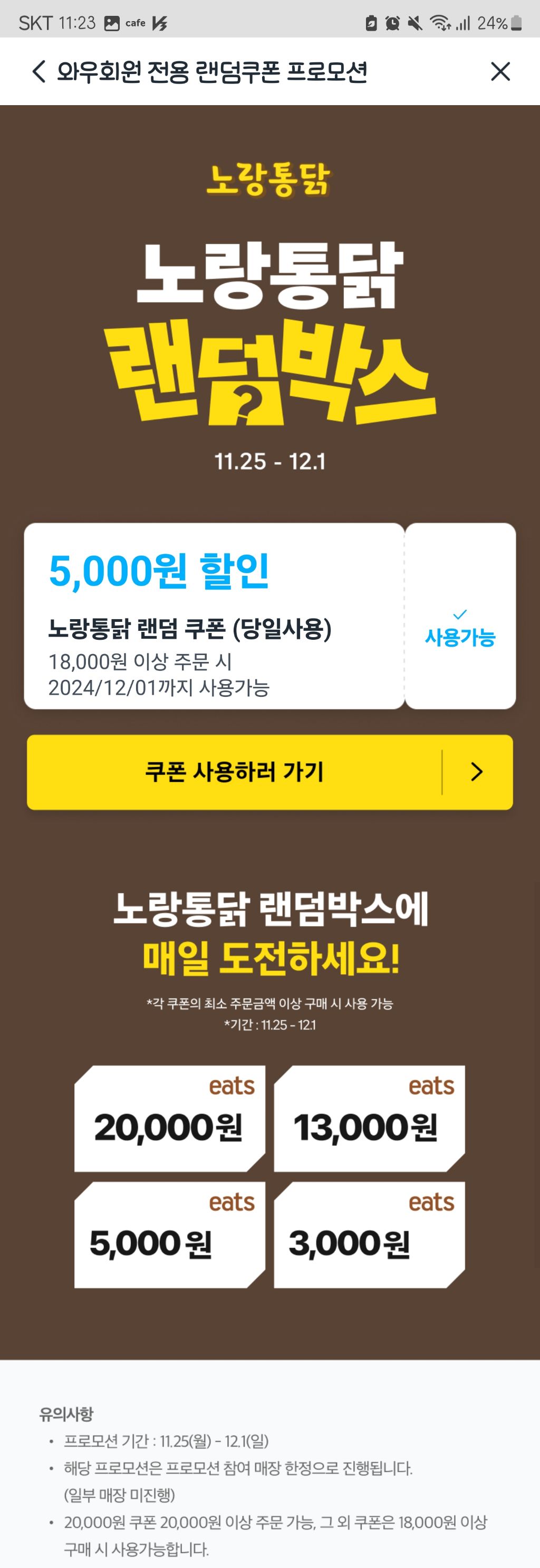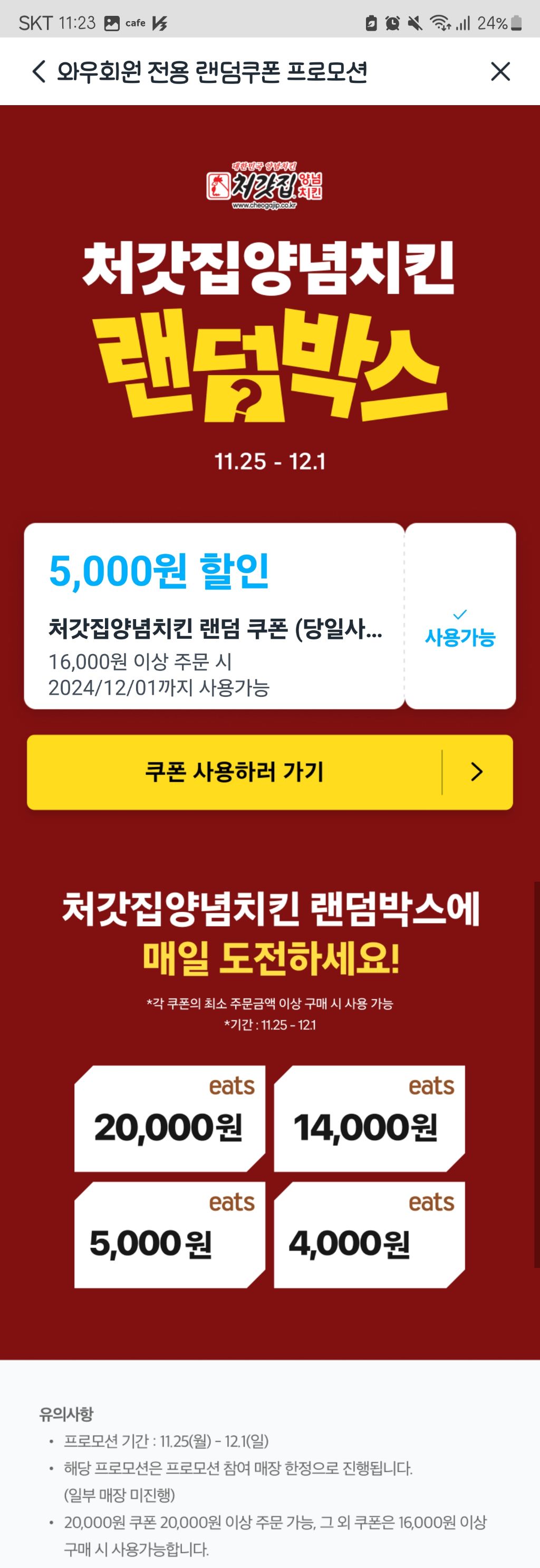 [쿠팡이츠]노랑통닭, 처갓집양념치킨 최대 2만원 쿠폰 이벤트 작성자still my number one|작성시간24.12.01|조회수8,230 목록 댓글 14 글자크기 작게가 글자크기 크게가 출처 : 여성시대 (still my number one)쿠팡이츠 -> 메인화면에서 이벤트 배너 전체보기 클릭 다음검색 현재 게시글 추가 기능 열기 북마크 공유하기 신고 센터로 신고 댓글 댓글 14 댓글쓰기 답글쓰기 댓글 리스트 작성자야누가여기지스팟좀켜줘봐 | 작성시간 24.12.01 뭔 맨날시바 삼천원만 쳐주고 자빠졌냐 썩을놈들 작성자막걸리 | 작성시간 24.12.01 난 맨늘 최소금액이냐 ㅠㅠ 작성자기운없는사람 | 작성시간 24.12.01 오차난... 작성자Kindammme | 작성시간 24.12.01 노통이나 처갓집 팔아줄 여시 있으실까요!!!!!!!!! 작성자천억백억십억 | 작성시간 24.12.03 어쩐지 안 뜨더라 ㅎ.. 댓글 전체보기