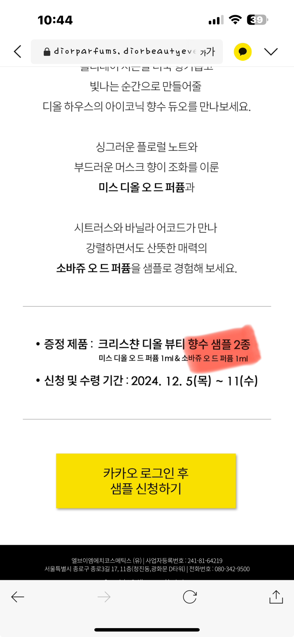 [무료이벤트]디올뷰티 홀리데이 향수 샘플링(~12/11일까지) 작성자스티치주식회사|작성시간24.12.05|조회수11,004 목록 댓글 23 글자크기 작게가 글자크기 크게가 출처 : 여성시대 (스티치주식회사)https://diorparfums.diorbeautyevent.co.kr/?utm_source=kakao&utm_content=share_202412holiday_sampling&utm_medium=social&utm_campaign=holidaysampling_kr_dec24_kakaoshare크리스챤 디올 뷰티 홀리데이 향수 샘플링 이벤트홀리데이 시즌을 더욱 향기롭고 빛나는 순간으로 만들어줄 디올 하우스의 아이코닉 향수 듀오를 만나보세요.diorparfums.diorbeautyevent.co.kr카카오톡 공유후 샘플신청가능! 다음검색 현재 게시글 추가 기능 열기 북마크 공유하기 신고 센터로 신고 댓글 댓글 23 댓글쓰기 답글쓰기 댓글 리스트 작성자SignOfTheTime | 작성시간 24.12.05 오!! 고마워 !! 작성자도미노헌터 | 작성시간 24.12.05 고마워!!! 작성자내가알러뷰그거해유 | 작성시간 24.12.06 아싸 바로 받았다 작성자나는휘황찬란 | 작성시간 24.12.06 고마워~! 신난다 작성자367084 | 작성시간 24.12.07 고마워! 댓글 전체보기