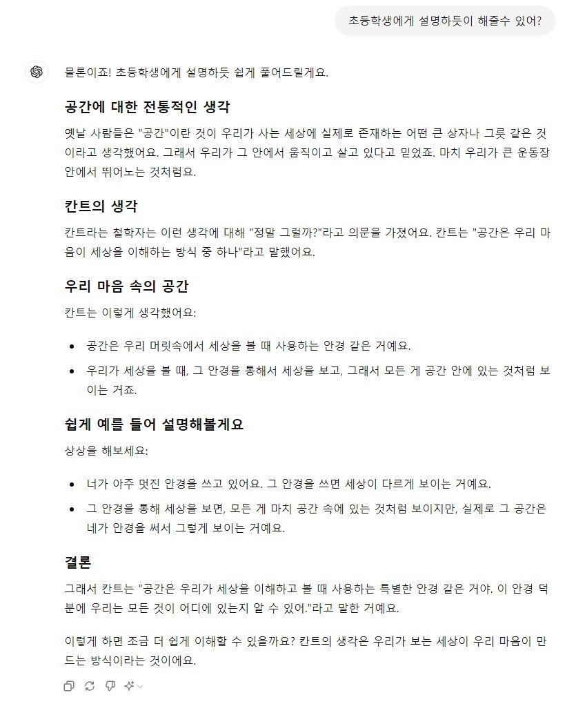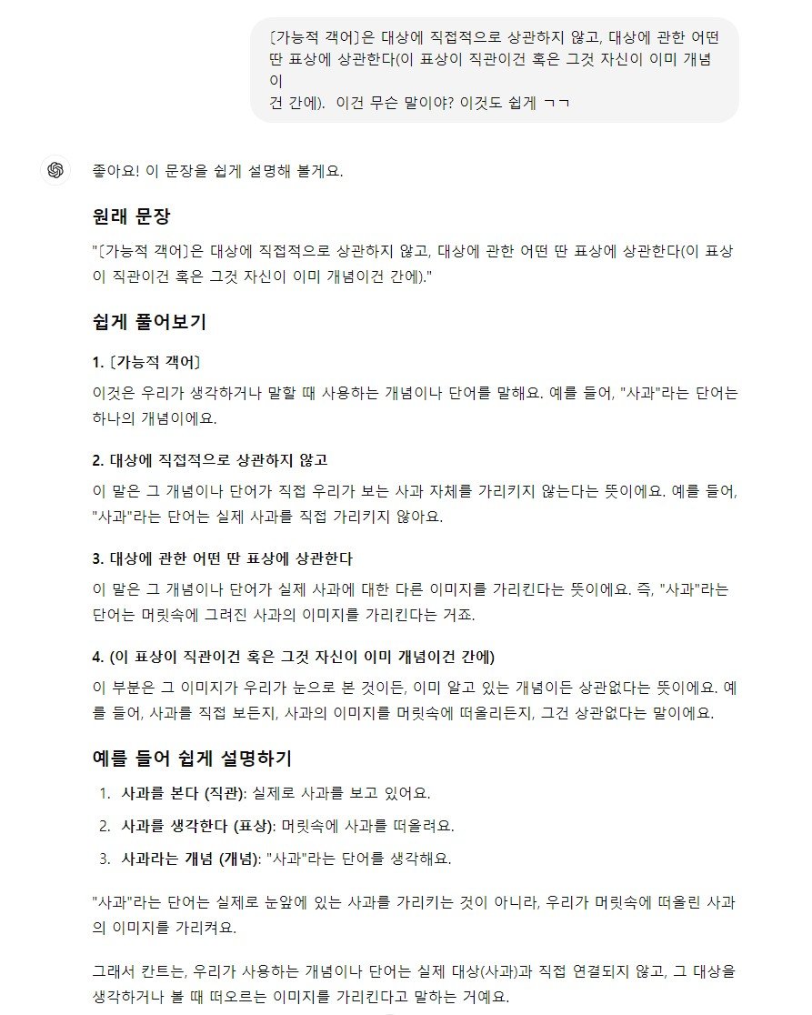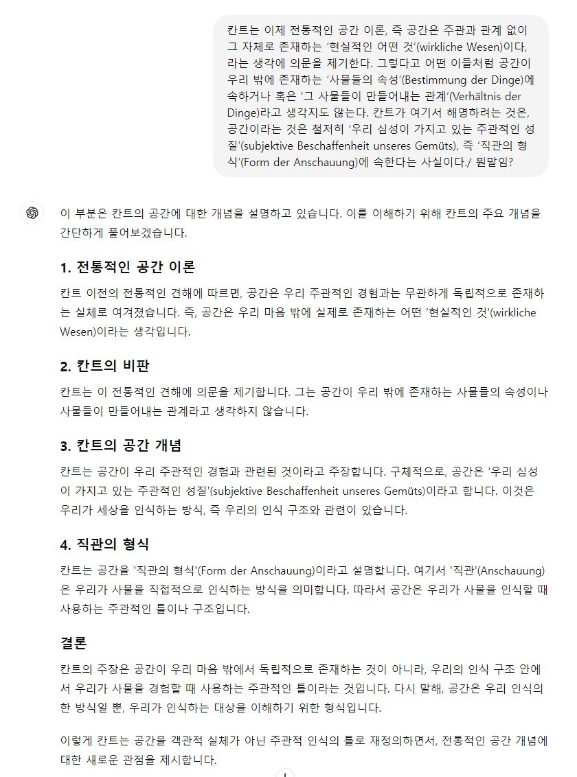 철학을 전혀 배운적이 없지만 챗GPT의 도움을 받아 칸트의 공간 / 인식에 대한 생각을 이해할 수 있었다.