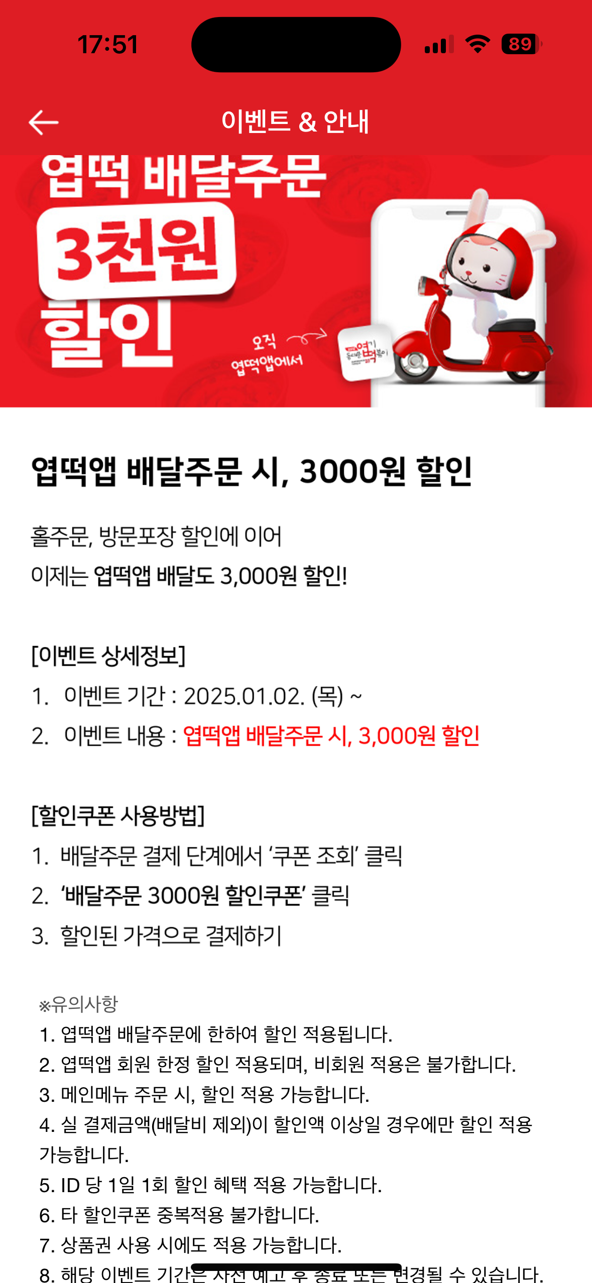 [무료이벤트]엽떡 배달 3천원 할인 작성자푸리냥|작성시간25.01.02|조회수21,815 목록 댓글 22 글자크기 작게가 글자크기 크게가 출처 : 여성시대 푸리냥 어플 주문 시 배달 3천원 할인포장도 3천원, 매장식사는 2천원 할인도 있음! 다음검색 현재 게시글 추가 기능 열기 북마크 공유하기 신고 센터로 신고 댓글 댓글 22 댓글쓰기 답글쓰기 댓글 리스트 작성자감기조심하자고 | 작성시간 25.01.02 디졋다 작성자CHAI | 작성시간 25.01.03 정보 고마워! 어플도 배달비 있는거지?? 3000원 있구나 배달비 할인 굿.. 작성자여미새 | 작성시간 25.01.03 뒤쟛다 작성자오이마켓 | 작성시간 25.01.05 다이어트하려고했는 데 하... 작성자LOVE and FEAR | 작성시간 25.01.05 아니 매장들 다 준비중 띄워놓네 너무해 ㅡㅡ 댓글 전체보기