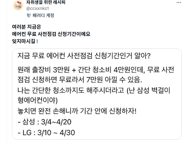작성자딩동댕덩 작성시간 25.03.27 정보 고마워! 에어컨 청소해야하는데.. 나도 신청해봐야겠다 ㅎㅎ