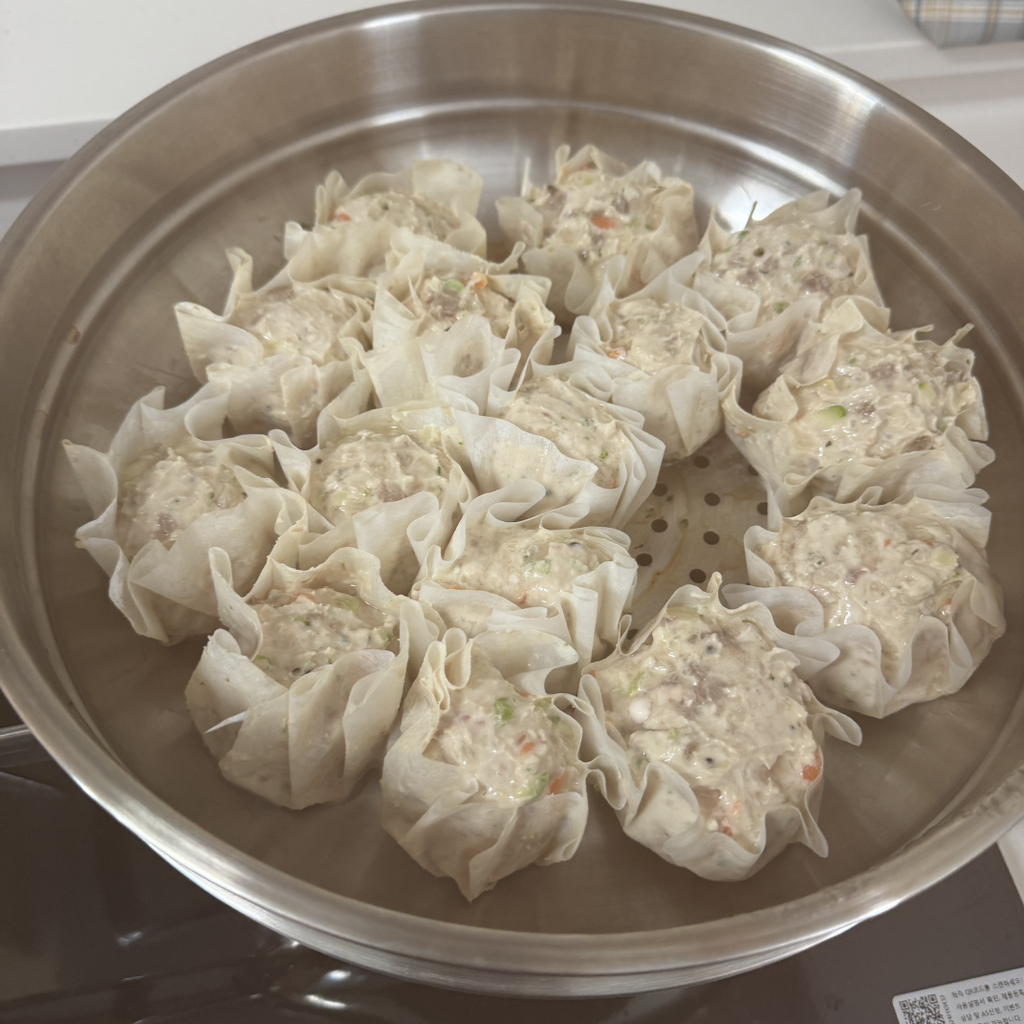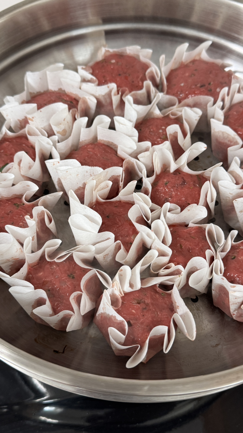 7) 찜기에 찜시트를 올려준 후, 빚어준 동그랑땡을 올리고 중불에서 15~20분간 쪄준다 (딤섬 속지 이용한 경우 찜시트 사용 안해도 됨)