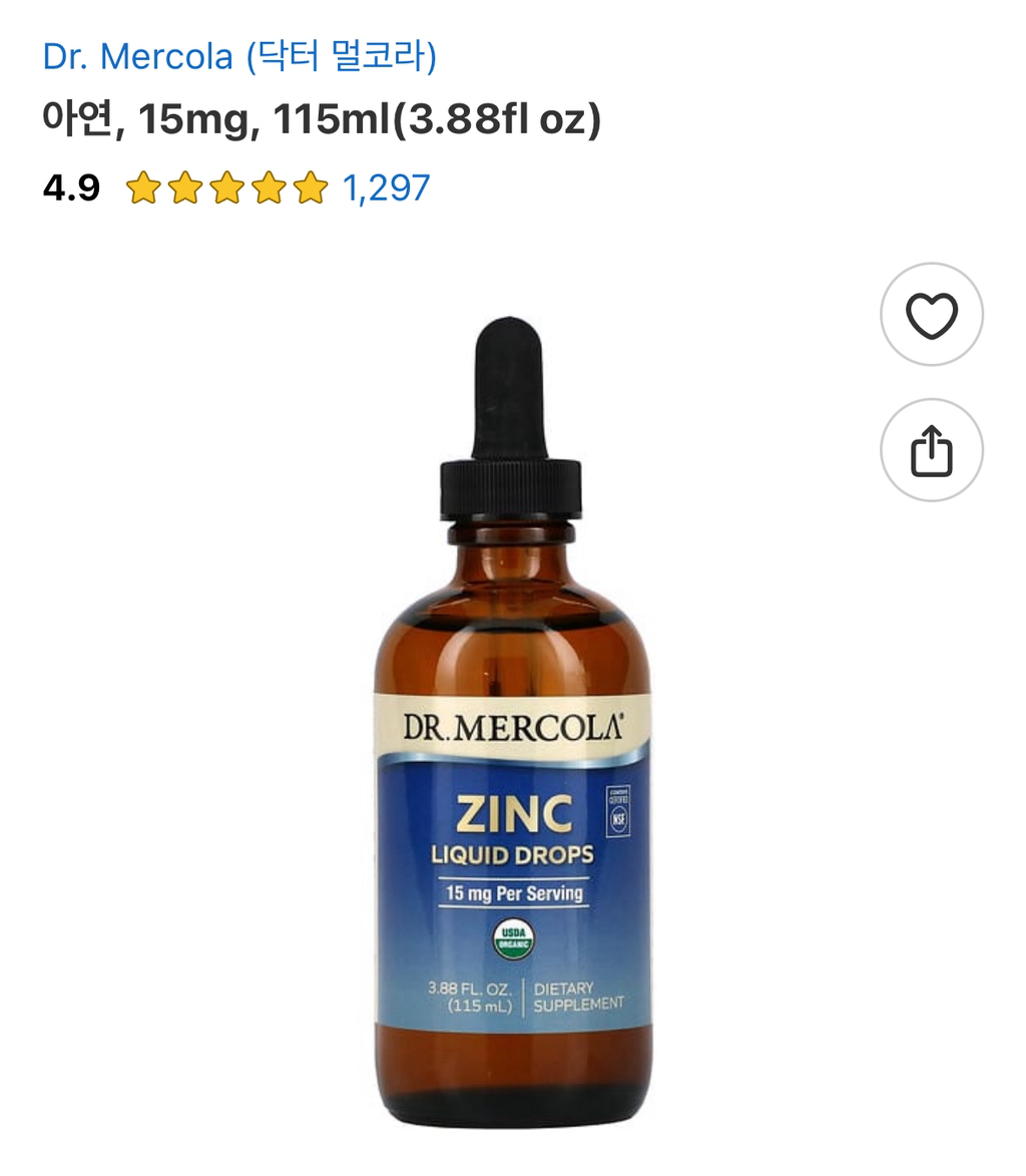 - Dr. Mercola Zinc liquid, 15 mg per serving (이 제품에는 유기농 사과주스가 포함되어 있는데, 아주아주 극 소량이라서 걱정 안하고 사용)