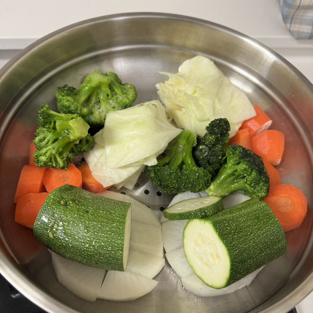 1) 채소류를 세척 후 적당한 크기로 잘라서 찜기에 설익을 정도로만 살짝 찐다. (너무 많이 찌면 채소에서 물나와서 반죽이 질어지므로 주의)