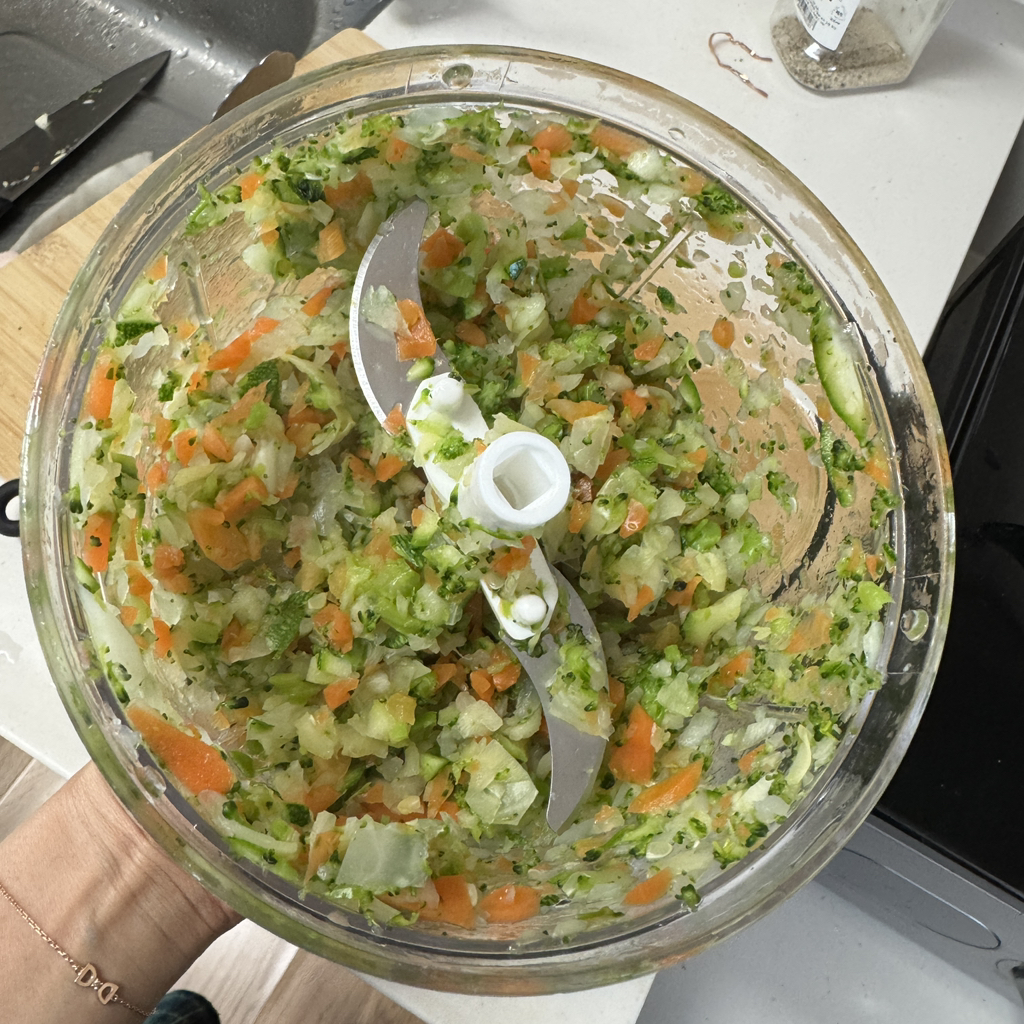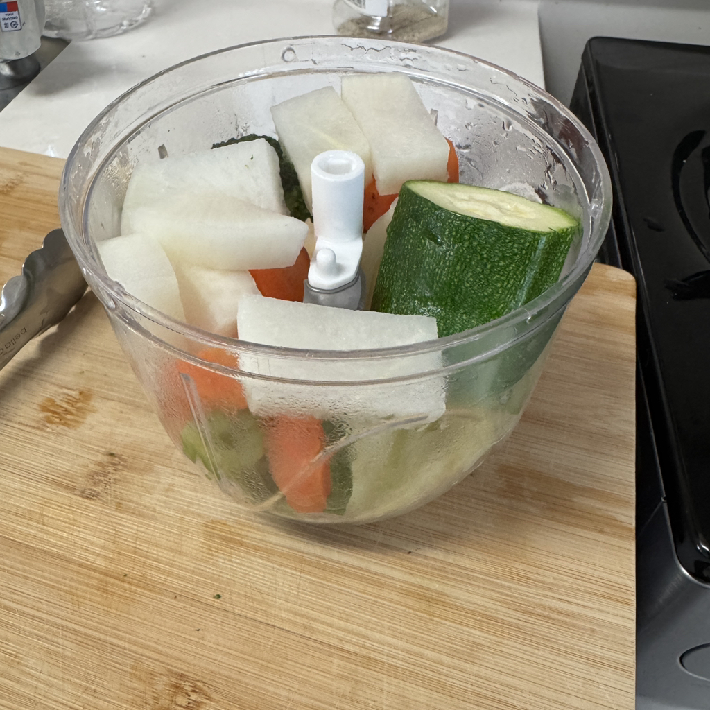 2) 설익은 채소류는 한김 식혀주고 만능 다지기에 넣어 다져준다 (너무 많이 다지지 않기, 적당히 잘게)