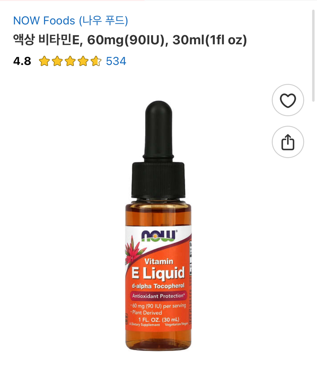 - Now, Vitamin E liquid, 90 IU per serving (아이허브 구매가능)