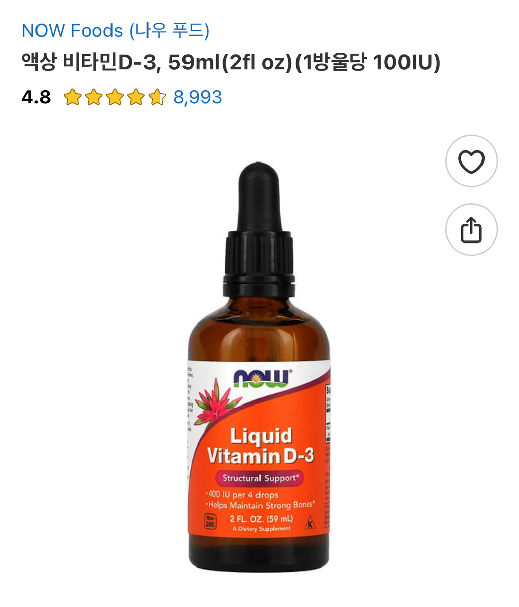 - Now, Vitamin D3 liquid, 400 IU per serving (아이허브 구매가능)
