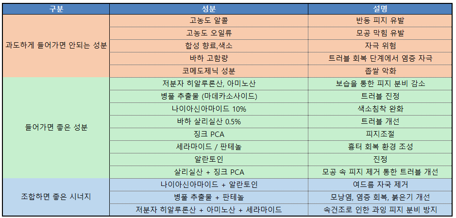 2. *들어가면 좋은 성분*: Helpful ingredients that improve the concern, with reason