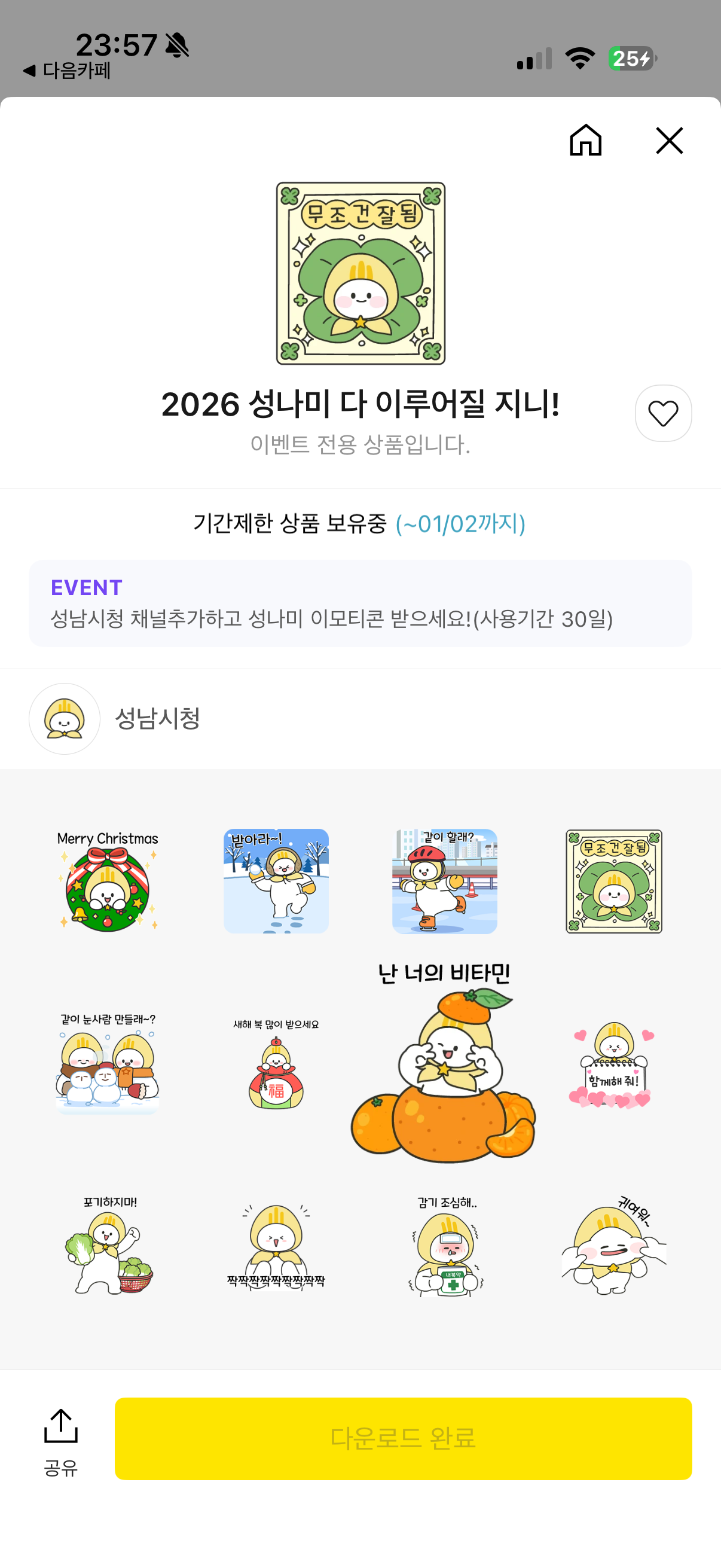 [무료이벤트]카카오톡 무료 이모티콘 작성자양참덮|작성시간25.12.03|조회수7,140 목록 댓글 25 글자크기 작게가 글자크기 크게가 출처 : 여성시대 양참덮http://pf.kakao.com/_NkLBV성남시청우리가 원하는 미래, 성남이 만듭니다.pf.kakao.com 졸귀 ㅠㅠ 다음검색 현재 게시글 추가 기능 열기 북마크 공유하기 신고 센터로 신고 댓글 댓글 25 댓글쓰기 답글쓰기 댓글 리스트 작성자행복은내곁에 | 작성시간 25.12.04 고마워~~!! 작성자젤시 | 작성시간 25.12.04 귀엽다 고마워! 작성자과군왕 | 작성시간 25.12.04 오 아직도 준다 고마워 작성자모모리넛 | 작성시간 25.12.04 고마워! 작성자범이올시다 | 작성시간 25.12.05 짱귀 고마워 댓글 전체보기