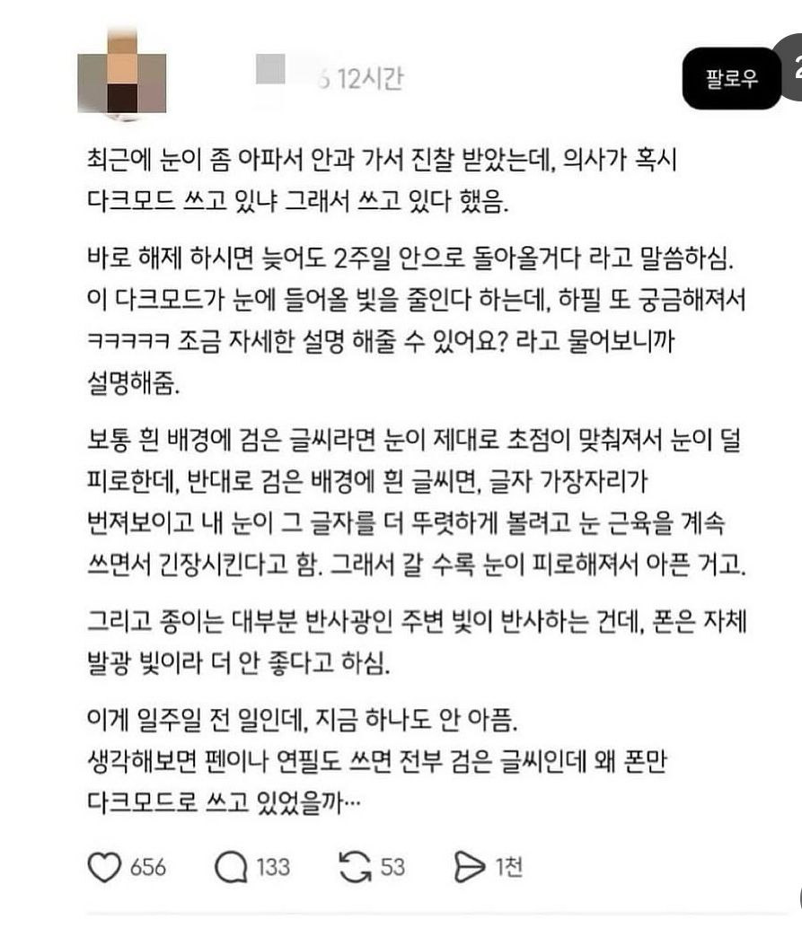[건강정보]다크모드 쓰지 마세요 작성자크리스마스쫀득쿠키|작성시간25.12.26|조회수57,374 목록 댓글 64 글자크기 작게가 글자크기 크게가 출처 : https://www.dmitory.com/issue/385668559 다음검색 현재 게시글 추가 기능 열기 북마크 공유하기 신고 센터로 신고 댓글 댓글 64 댓글쓰기 답글쓰기 댓글 리스트 작성자푸드케이크 | 작성시간 25.12.28 오.. 작성자카밀리라 | 작성시간 25.12.28 난 다크모드 답답해서 못보겠더라 작성자사노비의 노비 | 작성시간 25.12.28 배터리땜에 쓰는디.... . 작성자둘리두 | 작성시간 26.01.02 헐.. 작성자내가바로건물주 | 작성시간 26.01.03 라이트모드 확실히 눈이 편하네.. 댓글 전체보기