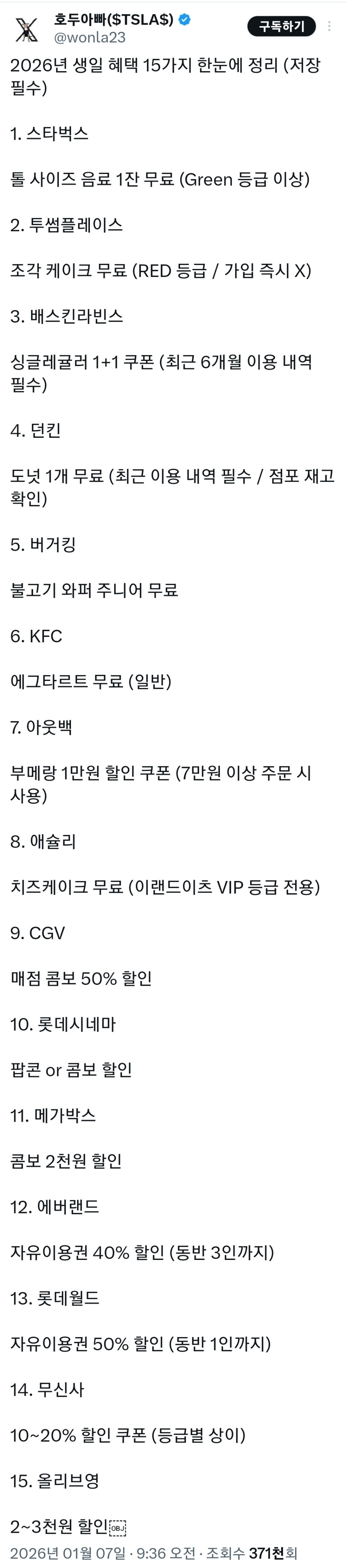 [스크랩] [기타]2026년 생일 혜택 15가지 한눈에 정리 작성자코수모수|작성시간26.01.11|조회수55,515 목록 댓글 21 글자크기 작게가 글자크기 크게가 https://x.com/i/status/2008699111797854296 다음검색 스크랩 원문 : 쭉빵카페 현재 게시글 추가 기능 열기 북마크 공유하기 신고 센터로 신고 댓글 댓글 21 댓글쓰기 답글쓰기 댓글 리스트 작성자챠롱롱 | 작성시간 26.01.12 곧 생일인데 감삼다 작성자나대신출근좀 | 작성시간 26.01.12 아 나 생일인데 어제 무신사가서 걍 결제했는데ㅠ 가서 결제취소하고 다시 결제해도 되려나ㅜ 작성자별이빛나뚬 | 작성시간 26.01.14 우와! 좋은정보 고마워!! 작성자에휴됐다됐어 | 작성시간 26.02.01 와 내가 찾던거 다있다 고마워🥰🥰 작성자셋이왔어용넷이왔어용 | 작성시간 26.02.11 고마워!! 생일달 알차게 챙겨야지 댓글 전체보기