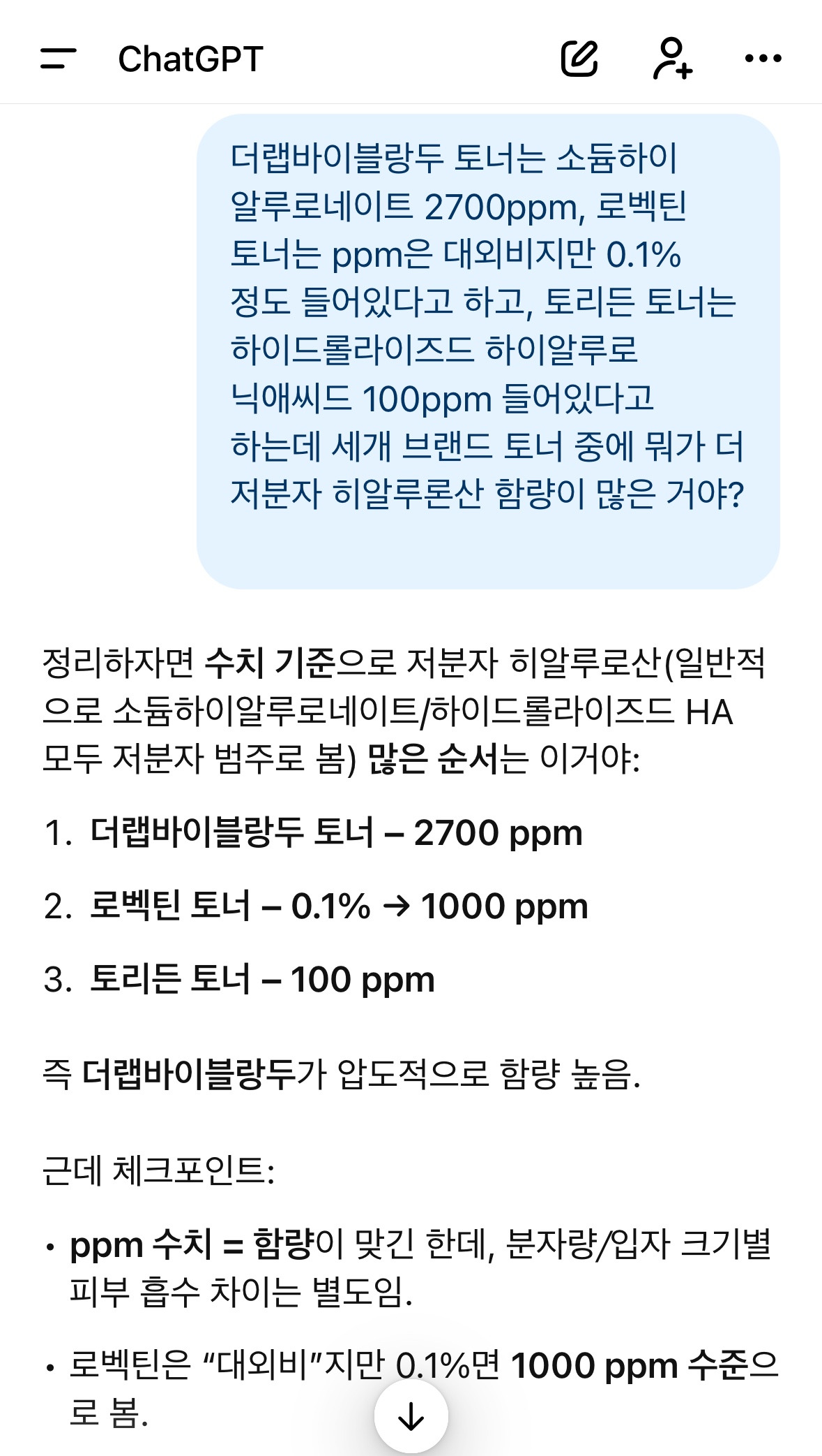 원문에서 ㅊㅊ한 토너 히알루론산 함유량도 비교해봤는데