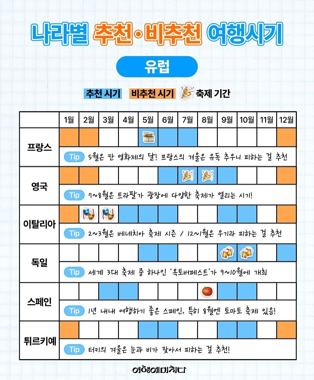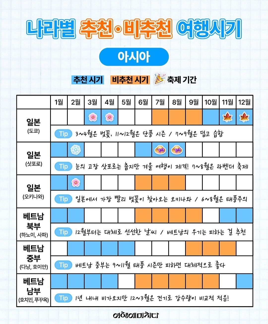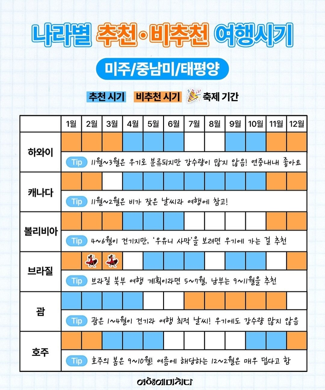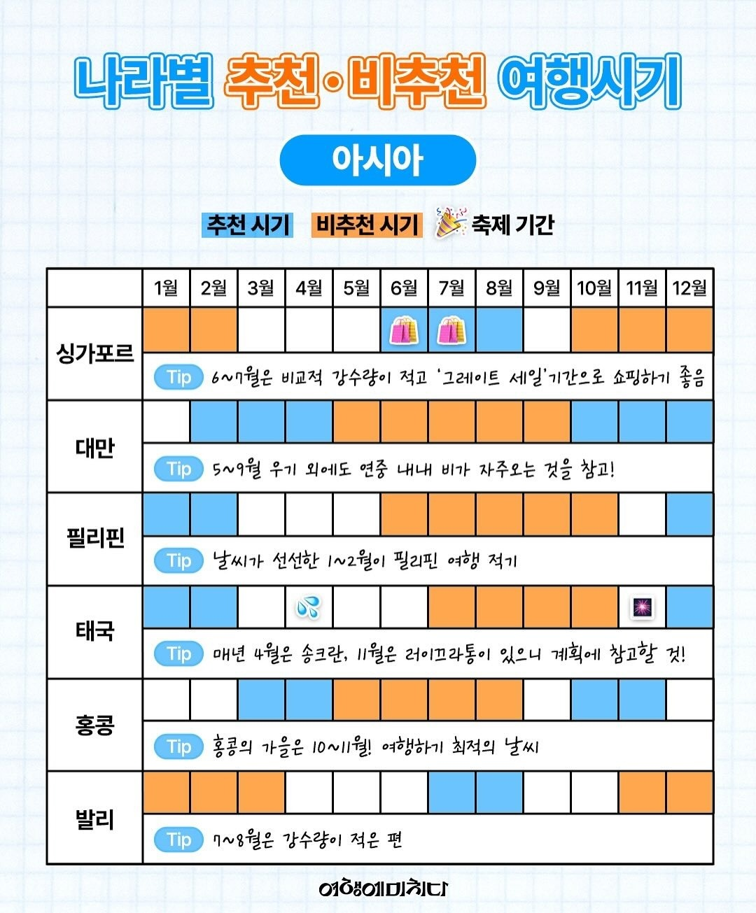 [여행]나라별 추천, 비추천 여행 시기 정리 작성자두존크레용|작성시간26.01.19|조회수24,646 목록 댓글 16 글자크기 작게가 글자크기 크게가 출처 : https://x.com/i/status/2009917736189866459 다음검색 현재 게시글 추가 기능 열기 북마크 공유하기 신고 센터로 신고 댓글 댓글 16 댓글쓰기 답글쓰기 댓글 리스트 작성자내사랑하는사람들건강행복 | 작성시간 26.01.22 고마워!!! 작성자그만좀해진짜로 | 작성시간 26.01.22 12월 태국 날씨 짱 좋았어! 작성자홈런붤 | 작성시간 26.01.25 호주 12월에 갔는데 여름이라 덥긴했어도 습한 더위가 아니라서 그런지 진짜 좋았어!!! (추운거 싫어하는 사람) 작성자니익네에이임 | 작성시간 26.01.29 싱가폴 저때가면 더워서 안되는줄 작성자행복해항상 | 작성시간 26.01.31 스페인 4월 바다수영가능할가!.. 댓글 전체보기