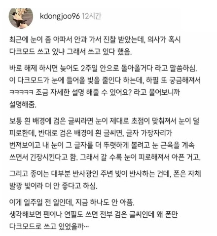 [건강정보]핸드폰 "다크모드" 쓰면 안되는 이유.jpg 작성자Car페인중독|작성시간26.01.19|조회수36,033 목록 댓글 24 글자크기 작게가 글자크기 크게가 출처 : https://theqoo.net/square/3983347525 눈 근육을 계속 긴장시켜서 피로하게 함어두운곳에서 폰하면 안되는것과 같음 다음검색 현재 게시글 추가 기능 열기 북마크 공유하기 신고 센터로 신고 댓글 댓글 24 댓글쓰기 답글쓰기 댓글 리스트 작성자반항적 | 작성시간 26.01.22 갤럭시 밝기 최적화 풀었다 고마워 작성자믱믱한 아아메 | 작성시간 26.01.24 급 바꿈.... 작성자기이이인숨 | 작성시간 26.01.26 나 진짜 다크모드 쓰고 눈 침침해졌는데 풀고 나서 몇주내로 바로 회복됨ㅜㅜ 작성자print(money) | 작성시간 26.01.29 개발자 여새덜 꼮꼮 ide 화이트모드 설정하락우 답댓글 작성자마르페 | 작성시간 26.01.31 이건 어떻게 하는거여?!? 댓글 전체보기