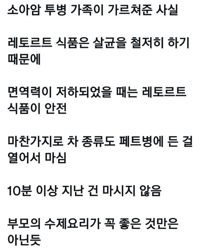 [스크랩] [생활정보]위염장염 걸렸을때는 편의점 캔죽을 먹는게 낫다 작성자acute|작성시간26.01.27|조회수10,512 목록 댓글 18 글자크기 작게가 글자크기 크게가 레토르트 음식은 진공 무균상태라 감염우려가 적다고 함 출처 : https://twitter.com/dodamcho/status/1436276099512614922?s=19 다음검색 스크랩 원문 : 우리 동네 목욕탕 현재 게시글 추가 기능 열기 북마크 공유하기 신고 센터로 신고 댓글 댓글 18 댓글쓰기 답글쓰기 댓글 리스트 작성자나는행복한고구마 | 작성시간 26.01.28 헉글쿠나 작성자소원성취이 | 작성시간 26.01.28 요즘에 편의점에 캔죽은 없던데 다 페트로 바뀌었어ㅠㅜ 답댓글 작성자모카크림빵제빵사 | 작성시간 26.01.28 재질보단 밀봉이 포인트인듯! 파우치로 된 죽도 있으니까 답댓글 작성자소원성취이 | 작성시간 26.01.28 모카크림빵제빵사 아아 알려줘서 고마워 작성자konkidown | 작성시간 26.01.29 파우치죽도 다 무균이라 캔아니여도 그거 먹음 될듯!! 댓글 전체보기
