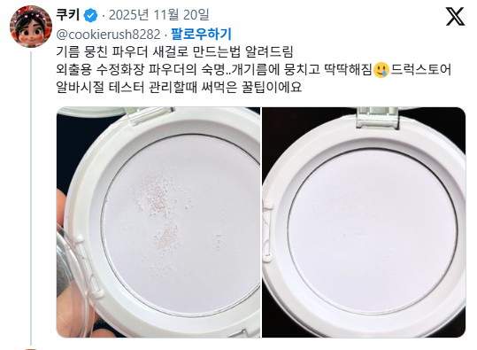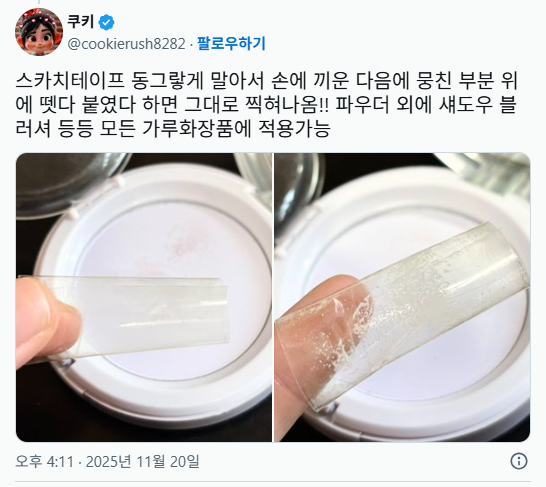 [생활정보]기름 뭉친 파우더 새걸로 만드는법 알려드림 작성자마시멜로우불구이|작성시간26.01.30|조회수34,677 목록 댓글 10 글자크기 작게가 글자크기 크게가 출처 :https://x.com/cookierush8282/status/1991404073485312047 X의 쿠키님(@cookierush8282)스카치테이프 동그랗게 말아서 손에 끼운 다음에 뭉친 부분 위에 뗏다 붙였다 하면 그대로 찍혀나옴!! 파우더 외에 섀도우 블러셔 등등 모든 가루화장품에 적용가능x.com 다음검색 현재 게시글 추가 기능 열기 북마크 공유하기 신고 센터로 신고 댓글 댓글 10 댓글쓰기 답글쓰기 댓글 리스트 작성자반박시니말이다맞음 | 작성시간 26.01.31 아이섀도우도 ㅋㅋㅋㅋ 옛날에 여시에서보고 잘써먹는중,, 작성자급등주진짜안탄다내가 | 작성시간 26.01.31 난왜 이거 안될까..안붙어ㅠㅠ 작성자레몬라임비터스 | 작성시간 26.01.31 헐 대박 나 막 칼로 긁고 난리도 아니었는디 작성자하느냐고X희안하다X됌X심난X됬X | 작성시간 26.02.01 나도 저렇게 해 ㅋㅋㅋ 작성자발빠짐주의발빠짐주의 | 작성시간 26.02.01 고마워여샤 여시는 천재야 댓글 전체보기