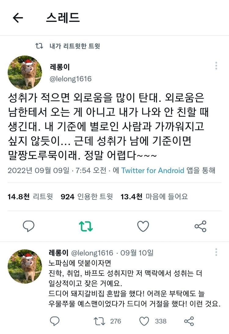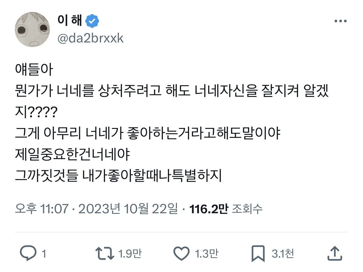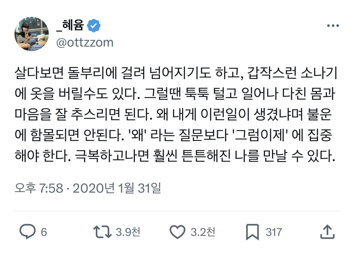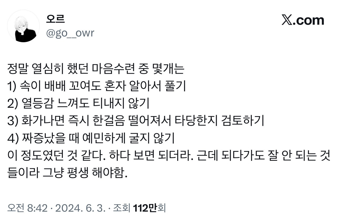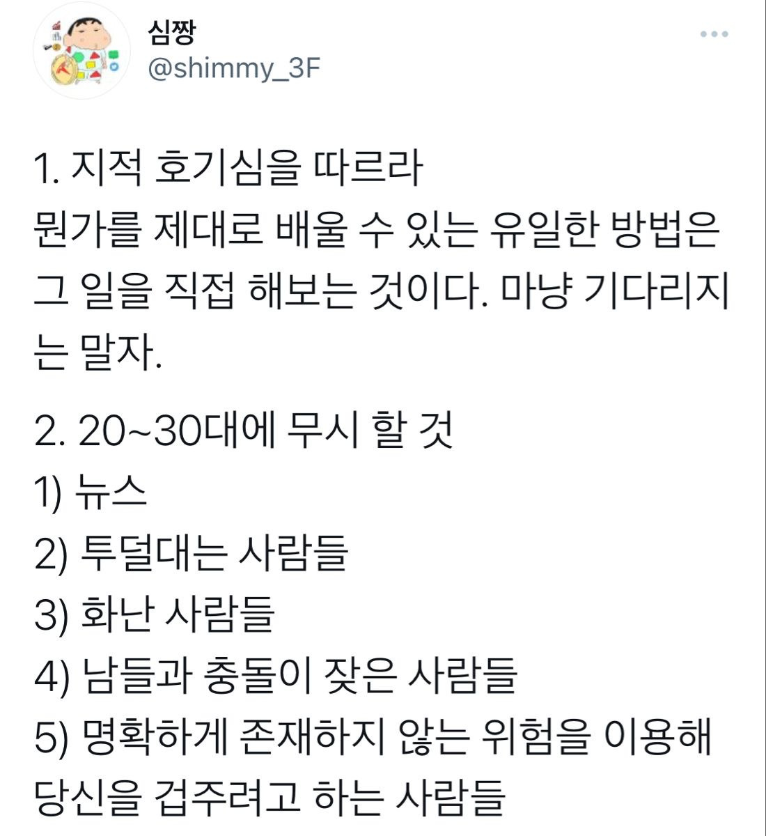 [짤털]인생 꿀팁 다 풀었음 작성자안녕허손요|작성시간26.03.02|조회수133,783 목록 댓글 647 글자크기 작게가 글자크기 크게가 출처 : 여성시대 안녕허손요 다음검색 현재 게시글 추가 기능 열기 북마크 공유하기 신고 센터로 신고 댓글 댓글 647 댓글쓰기 답글쓰기 댓글 리스트 작성자건들지마라ㄹ | 작성시간 26.03.15 굿 작성자훌라훌라훌라프 | 작성시간 26.03.15 필요했어 고마워 작성자슬로운 | 작성시간 26.03.18 바이블이다ㅜ 작성자따봉여시들 | 작성시간 26.03.19 북마크해놓고 또 보러왔어.. 너무 좋아 ㅠ 내 길잡이야... 힘들때 넘나 힘이돼 작성자Noel Gallagher | 작성시간 26.03.23 지금 내 상황에 와닿는 문장들이 너무 많다 고마워 위로해주는 멋진 사람들이 참 많네 댓글 전체보기