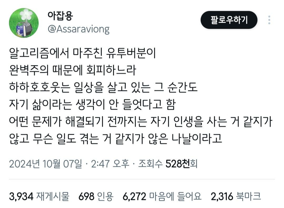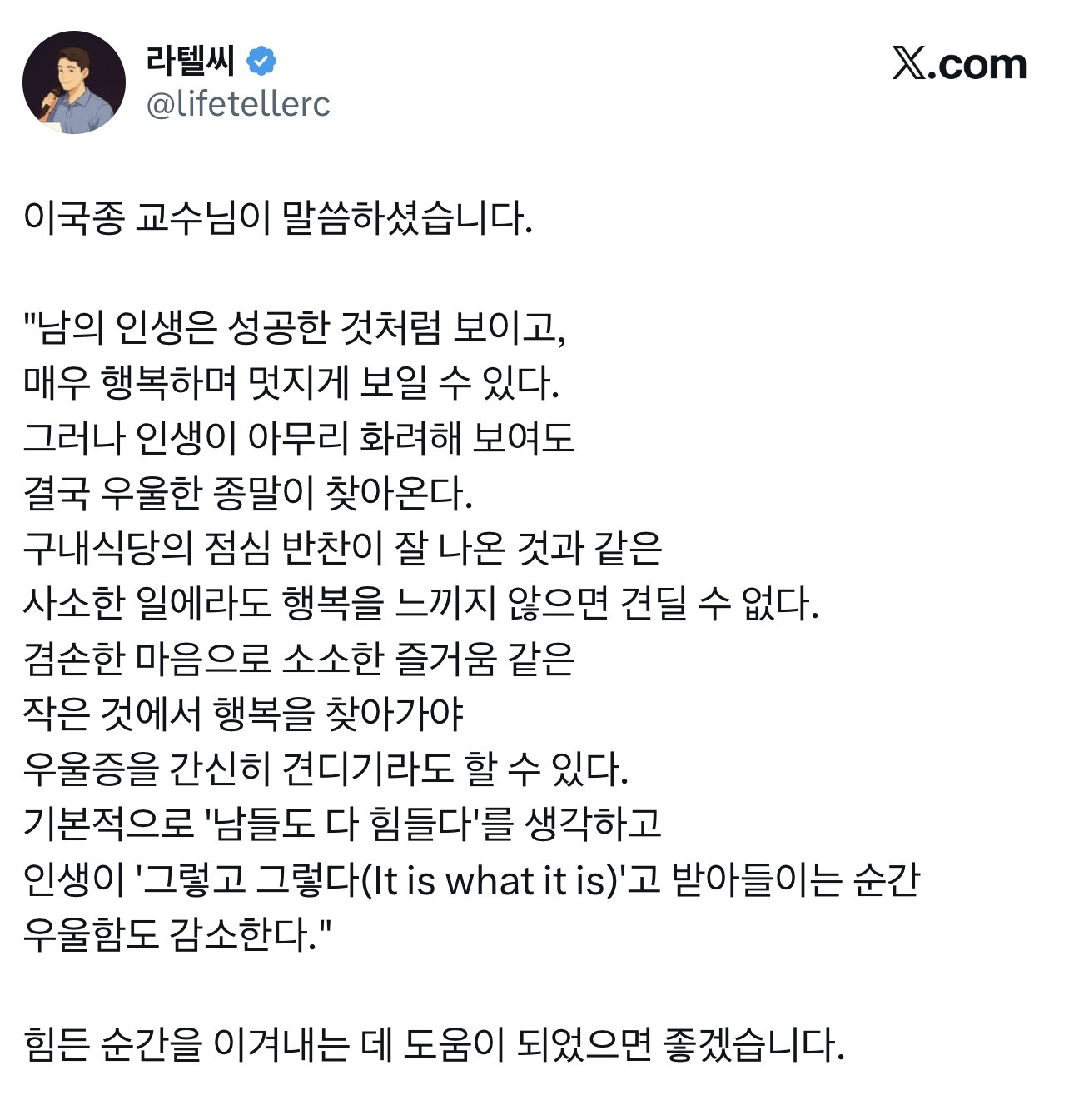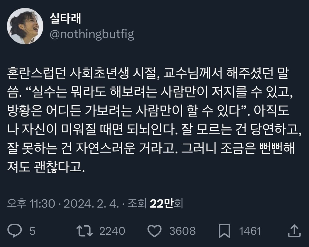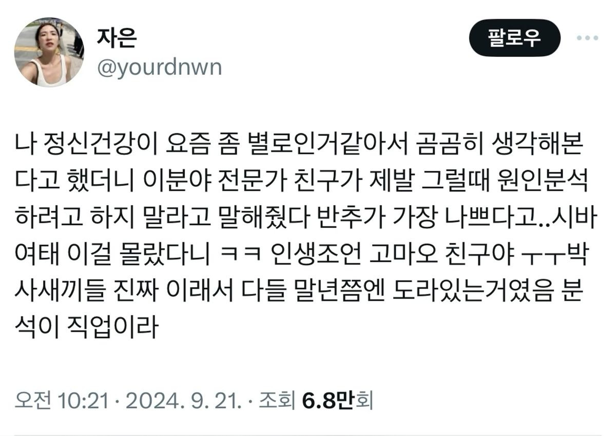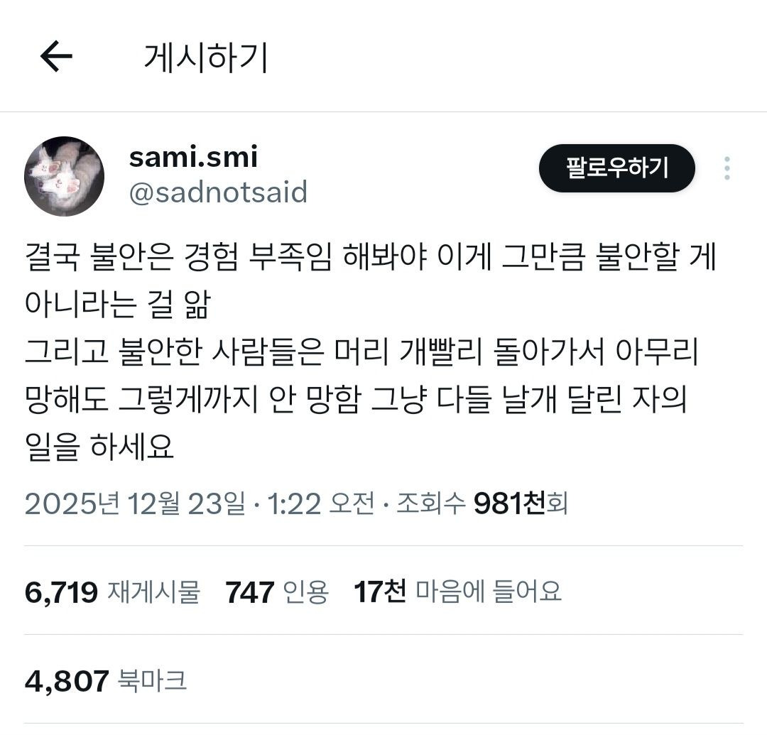 [짤털]인생 꿀팁 다 풀었음 작성자안녕허손요|작성시간26.03.02|조회수133,783 목록 댓글 647 글자크기 작게가 글자크기 크게가 출처 : 여성시대 안녕허손요 다음검색 현재 게시글 추가 기능 열기 북마크 공유하기 신고 센터로 신고 댓글 댓글 647 댓글쓰기 답글쓰기 댓글 리스트 작성자건들지마라ㄹ | 작성시간 26.03.15 굿 작성자훌라훌라훌라프 | 작성시간 26.03.15 필요했어 고마워 작성자슬로운 | 작성시간 26.03.18 바이블이다ㅜ 작성자따봉여시들 | 작성시간 26.03.19 북마크해놓고 또 보러왔어.. 너무 좋아 ㅠ 내 길잡이야... 힘들때 넘나 힘이돼 작성자Noel Gallagher | 작성시간 26.03.23 지금 내 상황에 와닿는 문장들이 너무 많다 고마워 위로해주는 멋진 사람들이 참 많네 댓글 전체보기