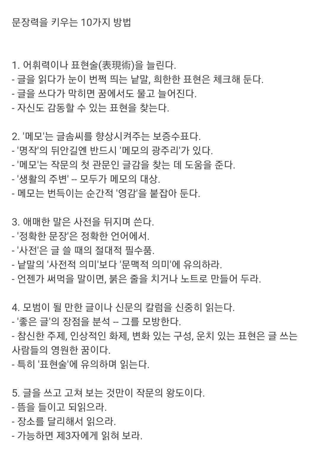[생활정보]문장력을 키우는 10가지 방법.jpg 작성자불멍물멍차트멍|작성시간26.03.05|조회수12,419 목록 댓글 6 글자크기 작게가 글자크기 크게가 출처 : https://theqoo.net/square/2361419368 다음검색 현재 게시글 추가 기능 열기 북마크 공유하기 신고 센터로 신고 댓글 댓글 6 댓글쓰기 답글쓰기 댓글 리스트 작성자태권 | 작성시간 26.03.05 좋다 ! 작성자건강가족돈명예행복사랑 | 작성시간 26.03.05 고마워 여샤~!! 작성자멋쟁이인데요 | 작성시간 26.03.06 요즘 생각과 말을 너무 나오는대로만 해서 글 쓰는거 힘들었는데 고마워!!! 작성자랄랄라사는게즐거워 | 작성시간 26.03.08 감사해요!!!!ㅎㅎ 작성자쑴히 | 작성시간 26.03.08 고마워 여샤!!! 댓글 전체보기