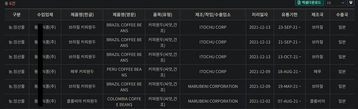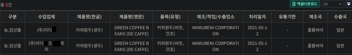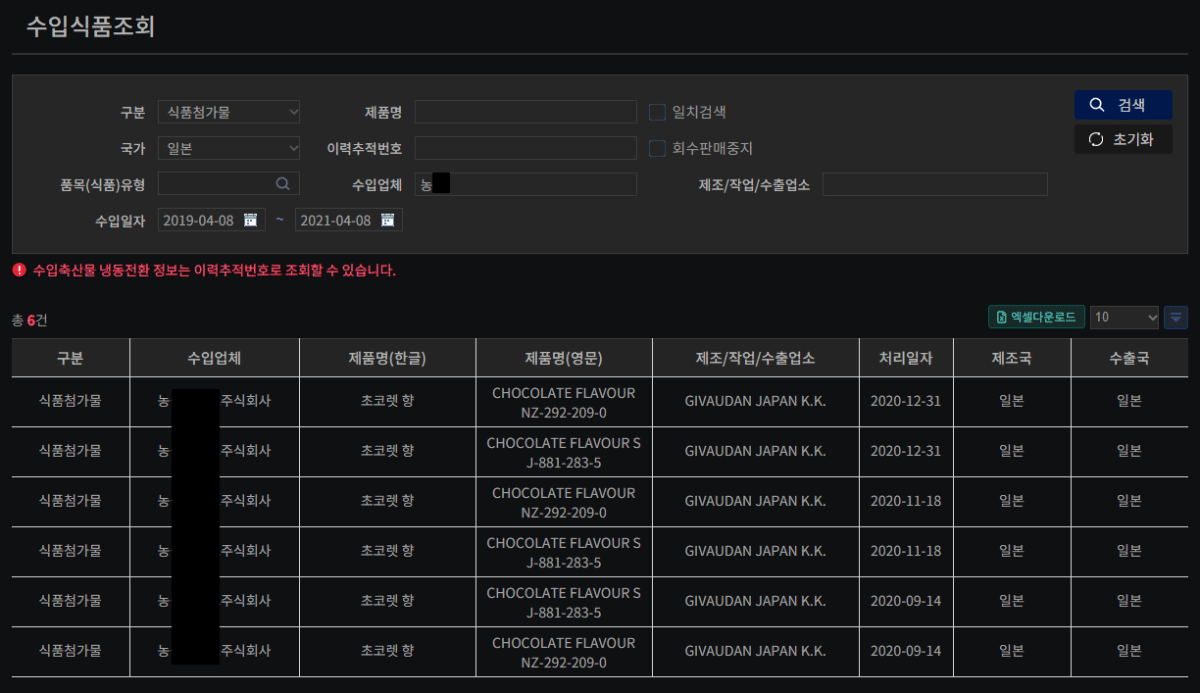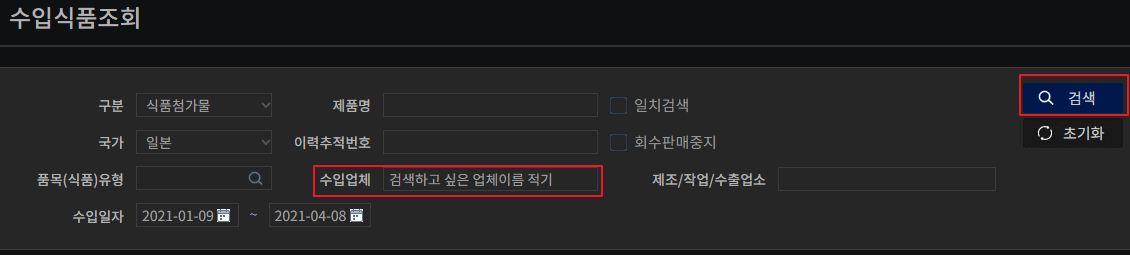 4. 수입업체 빈칸에 검색하고 싶은 업체 이름을 입력하고 오른쪽의 '검색' 버튼을 누른다.