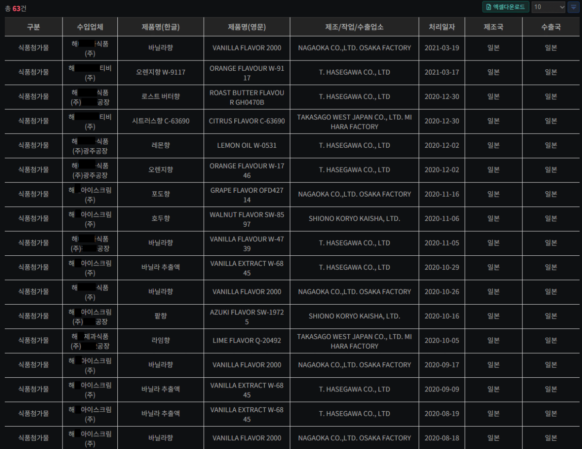 온갖 과일, 바닐라, 버터 향료등을 수입한 기업이 있고,
