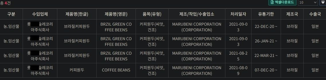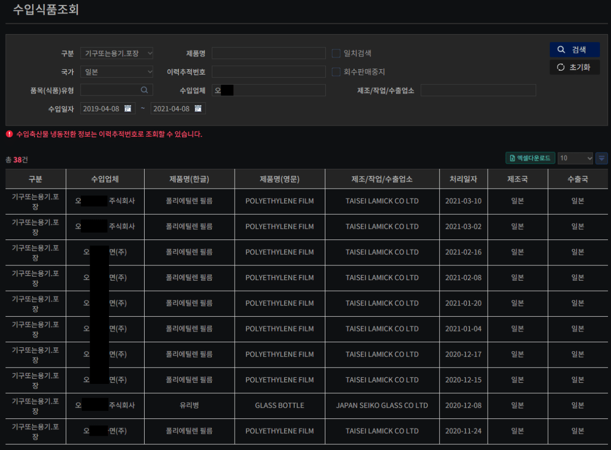 또 다른 유명 식품 제조 기업에서 가공식품 포장지를 일본으로 부터 수입한것을 알 수 있음