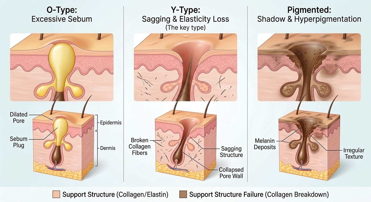 - 메커니즘: 이게 바로 2030의 주적, '탄력 저하형'임. 피부 진피층의 콜라겐 기둥이 무너지면서 모공 벽을 못 잡아주니까 중력 따라 흐르는 거.