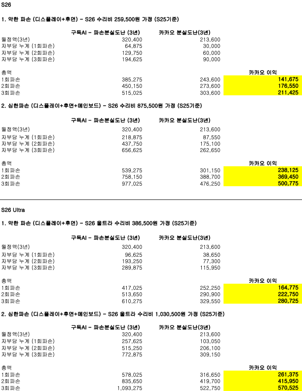★ S26은 파손 정도, 파손 횟수에 따라, 카카오가 14만원 ~ 50만원 저렴