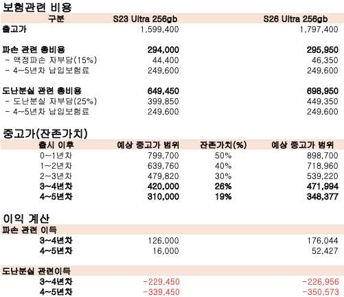 결론: 휴대폰은 소모품입니다. 감가가 워낙 심해서 굳이 4~5년까지 비싼 보험료 내며 유지할 실익이 거의 없어요.