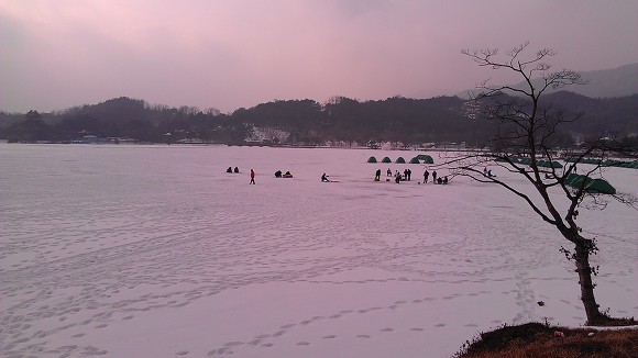 물이 다 얼고 눈이와서 사람들이 그냥 막 저수지 위로 그냥 다니고