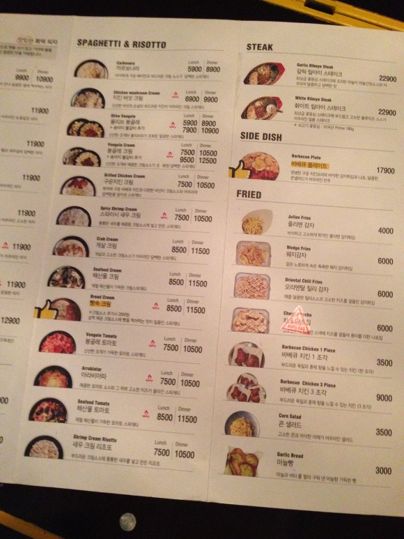 구운치킨크림파스타, 스파이시새우파스타, 치킨버섯크림파스타, 올리브봉골레, 해산물토마토, 매운닭볶음밥(?), 송아지갈비살피자 아라비아따 등등이있었다고한ㄷㅏㅎㅎㅎㅎㅎ