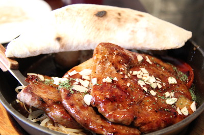 목살스테이크 저기 빵을 들추면 익힌 감자와 토마토 아스파라거스가 있고