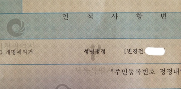 이렇게 성명정정 해놓고 변경전 이름이 기재되어 있어~