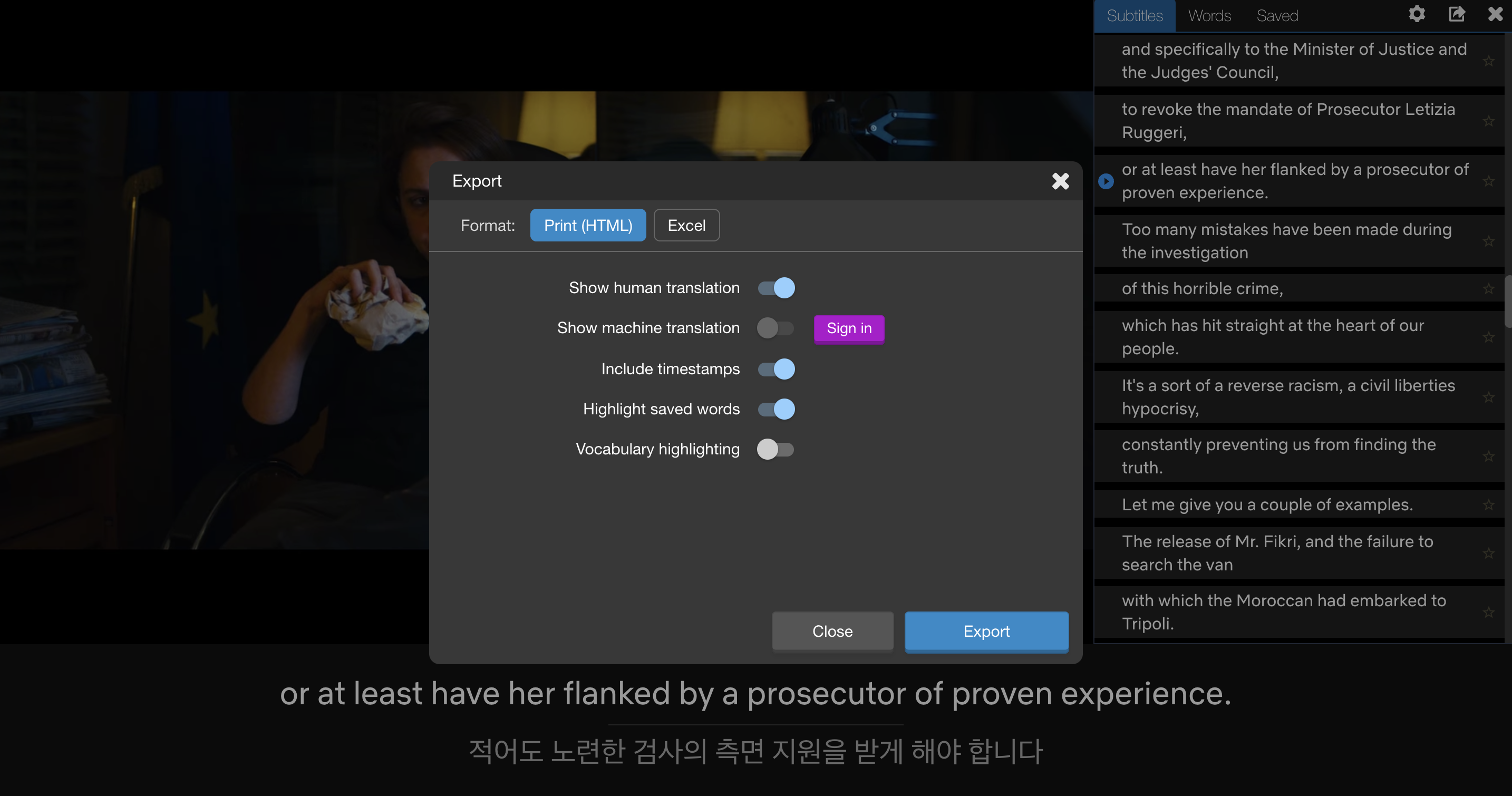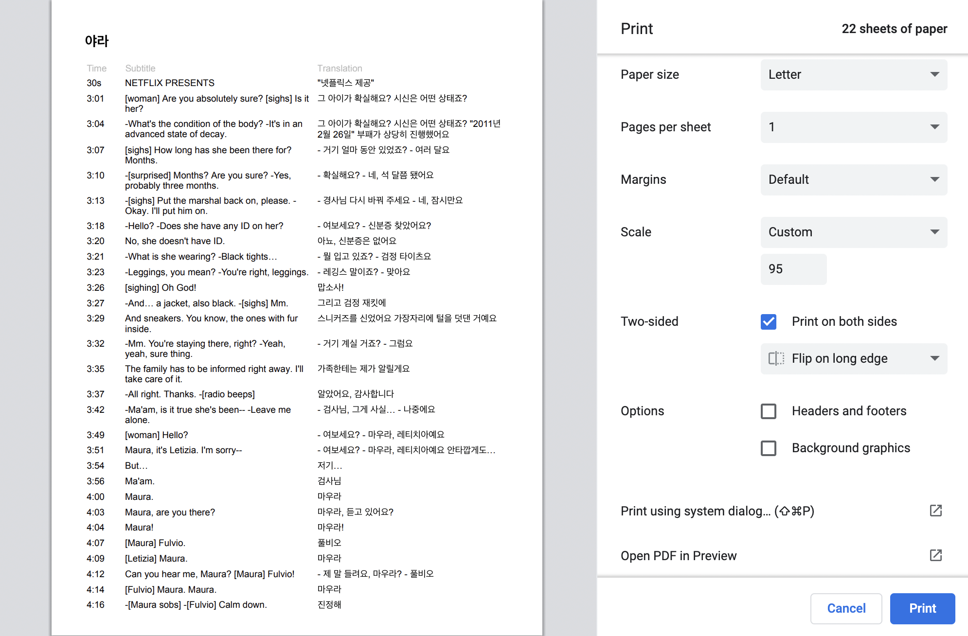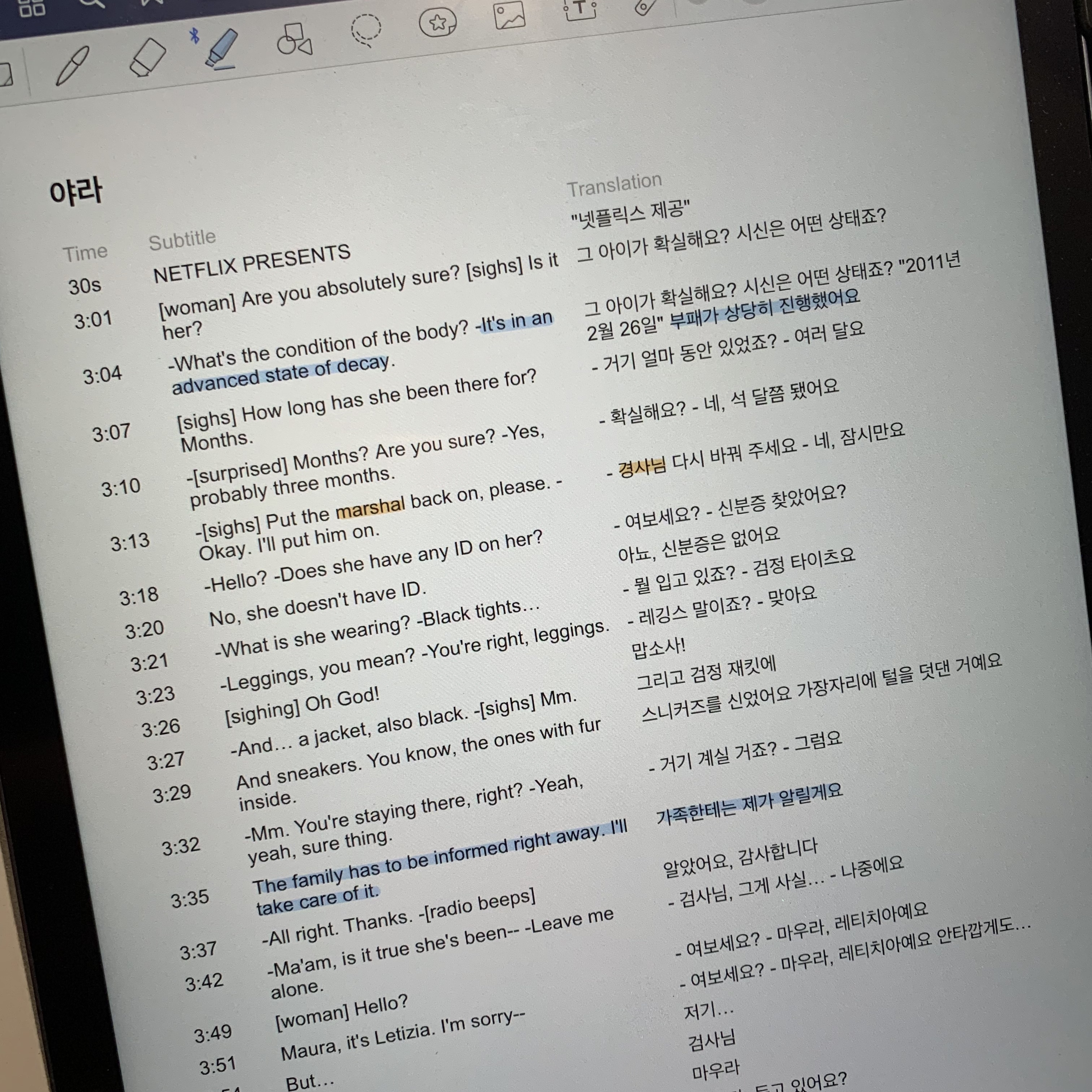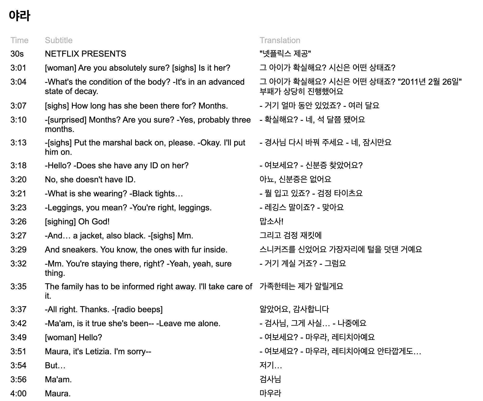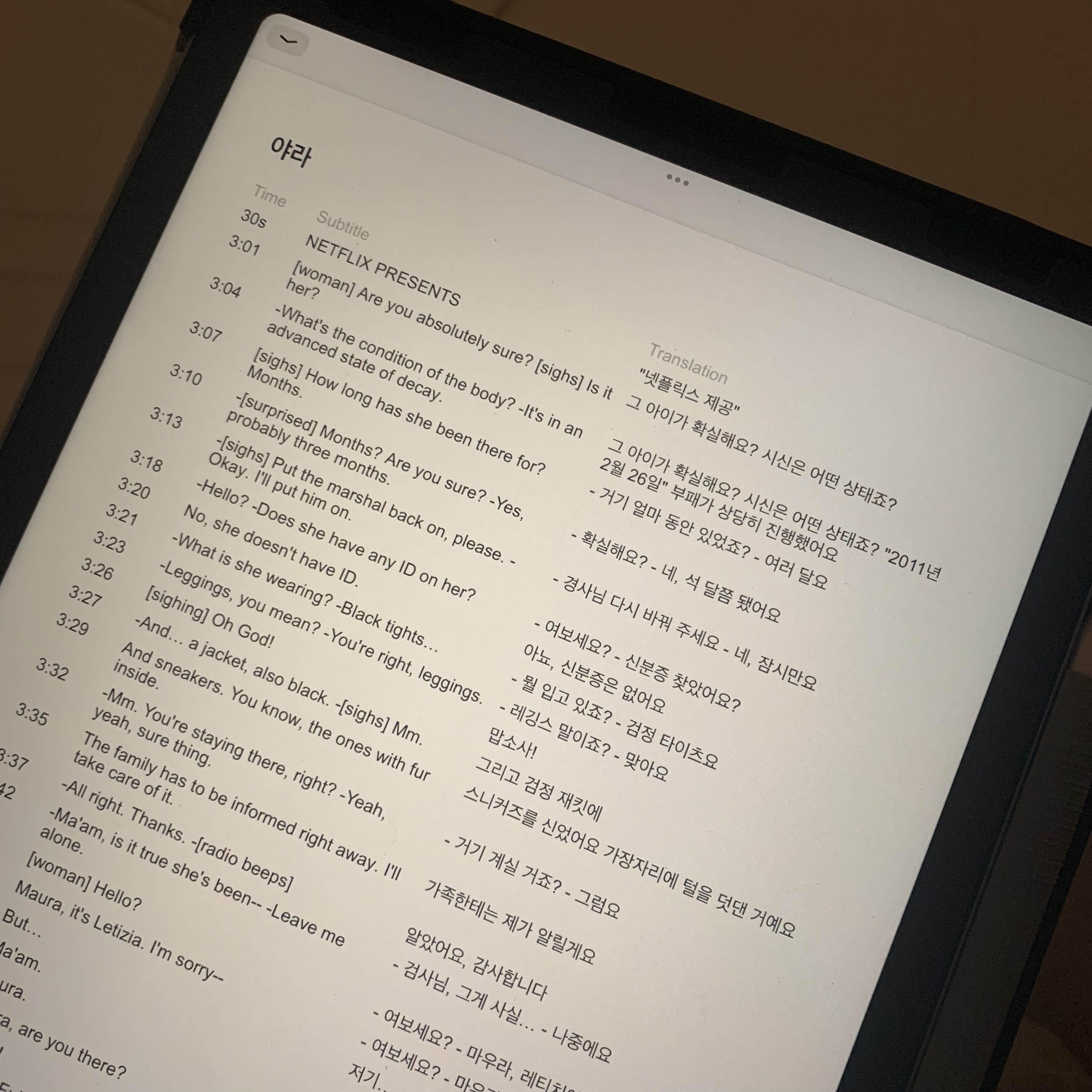 아래처럼 넷플 대본을 추출해서 한영자막을 비교하면서 공부할 수 있는 방법이여
