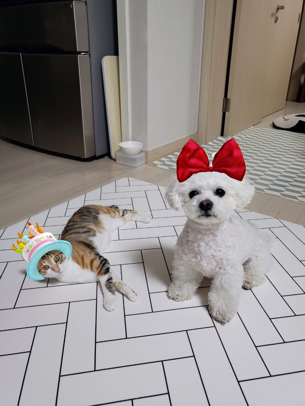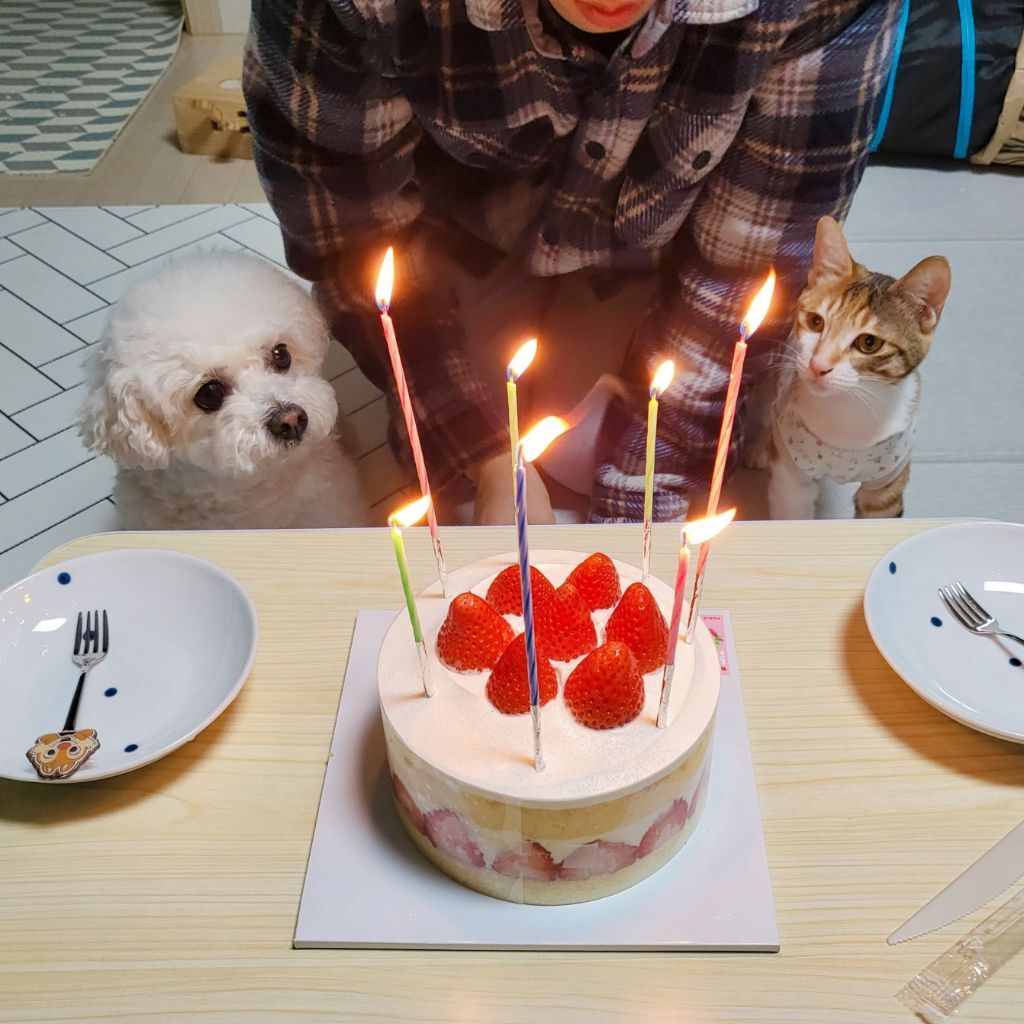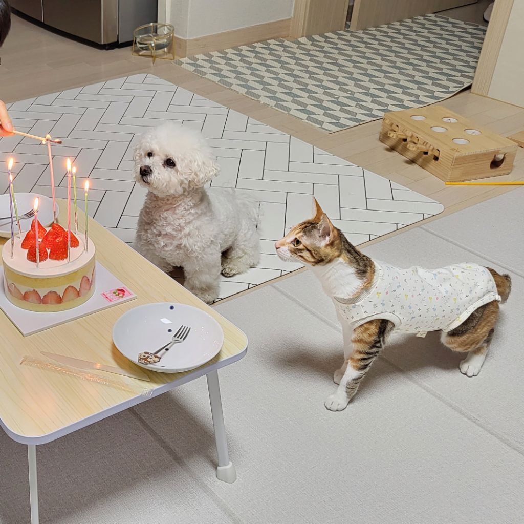 강아지는 그냥 앉아있었고 고양인 딴짓하다가 촛불 붙였더니 신기한지 구경와서 앉길래 얼른 찍음 ㅋㅋ