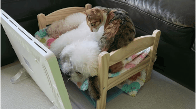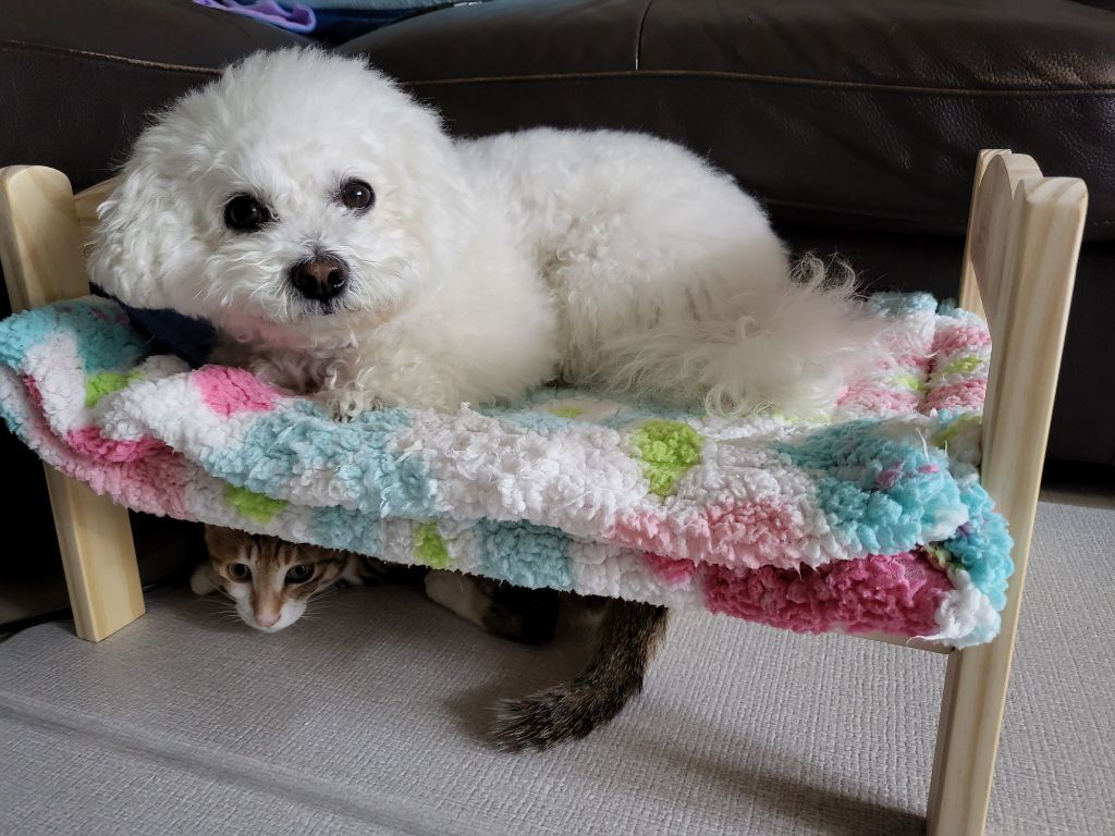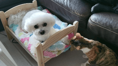 강아지는 원래 사람 침대에서만 잤는데 고양이가 여기서 자는거 보니까 좋아보였는지 요즘 자꾸 올라감