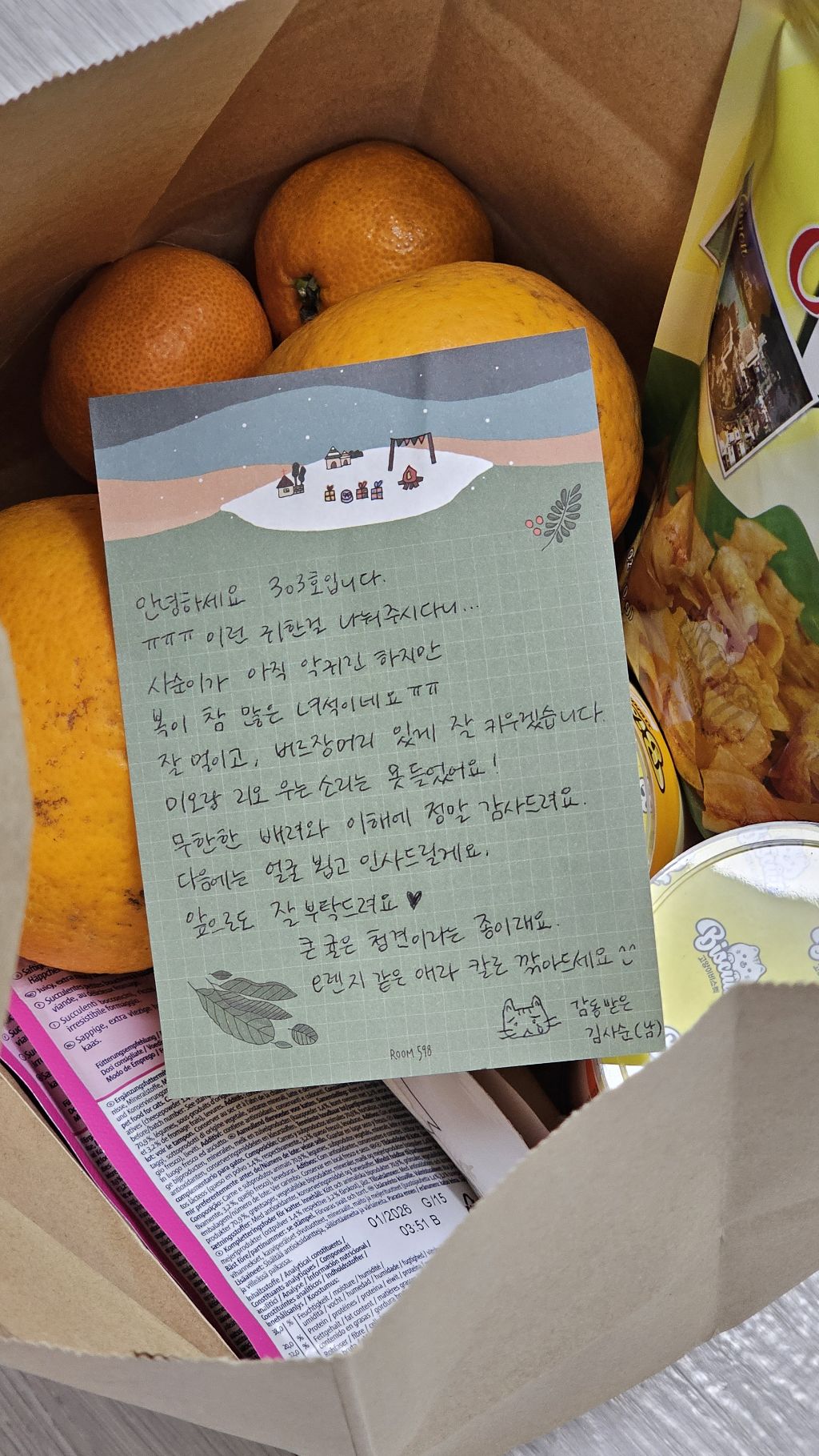 방금 문 앞에 203호분이 선물 두고 가셨어ㅠㅠ...