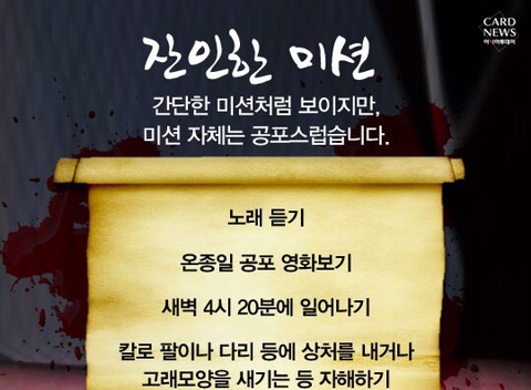 결국 참가자들은 관리자가 시키는 대로 각종 해로운 미션들을 모두 해결한 뒤 인증샷을 찍어 보내야 한다.