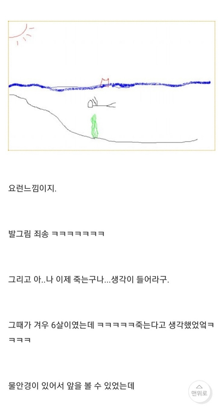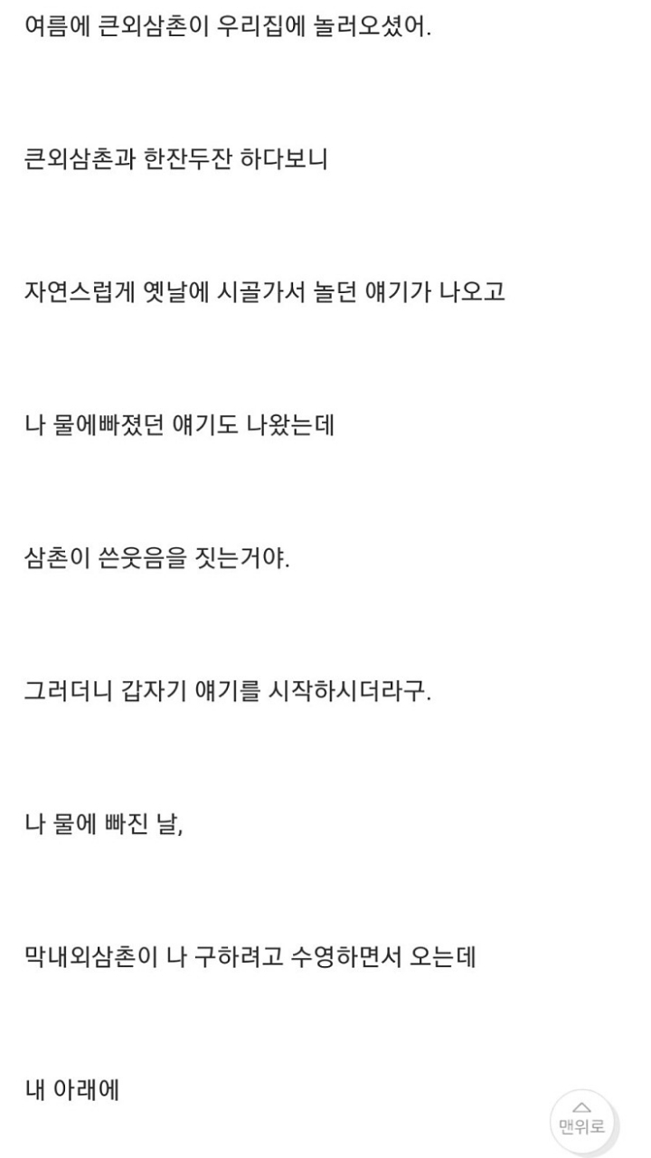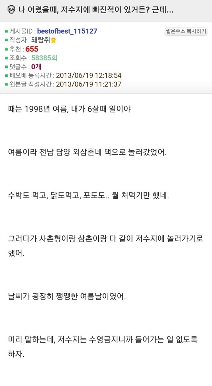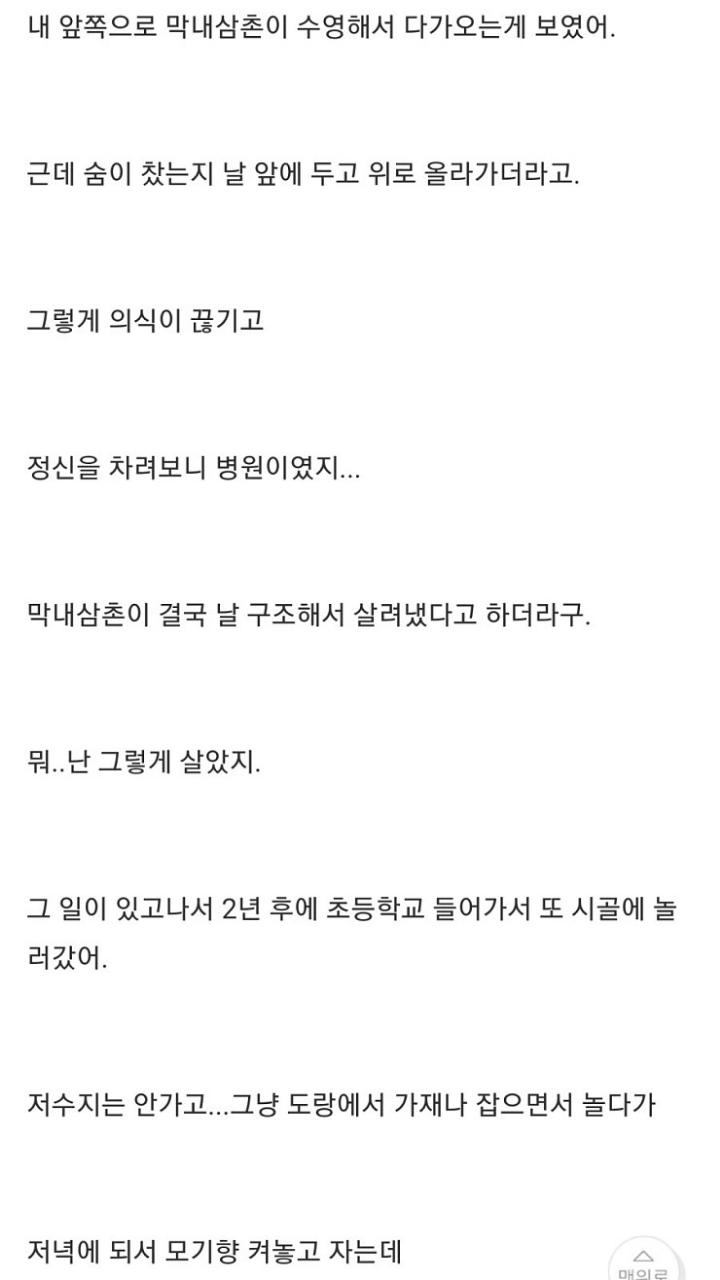 [기타]나 어렸을때 저수지에 빠진적 있거든? 근데... 작성자윤 신|작성시간22.05.19|조회수31,056 목록 댓글 22 글자크기 작게가 글자크기 크게가 출처 : http://www.todayhumor.co.kr/board/view.php?table=panic&no=50683나 어렸을때, 저수지에 빠진적이 있거든? 근데...때는 1998년 여름, 내가 6살때 일이야 여름이라 전남 담양 외삼촌네 댁으로 놀러갔었어. 수박도 먹고, 닭도먹고, 포도도.. 뭘 처먹기만 했네.www.todayhumor.co.kr 다음검색 현재 게시글 추가 기능 열기 북마크 공유하기 신고 센터로 신고 댓글 댓글 22 댓글쓰기 답글쓰기 댓글 리스트 작성자더이소 | 작성시간 25.11.03 옛날글인데 인기글이네?! 답댓글 작성자바람이 솛나솛 작성자 본인 여부 작성자 | 작성시간 25.11.03 ㄴㄷㄷㄷ3년전 글인데...?무사와요 무사와ㄱ핫플가서 조회수 올라가서 그런가부당ㅋㅋㅋㅋㄱ 답댓글 작성자스트로베리초콜릿무스 | 작성시간 25.11.03 헉스 무섭다 저는 핫플 무서운 글에서 왓어요.. 작성자새로운닉넴뭐하지 | 작성시간 25.11.03 아 너무 무섭다ㅠㅠ 삼촌 ㅠ 작성자베리a | 작성시간 25.11.04 무섭다ㅜㅠ 댓글 전체보기