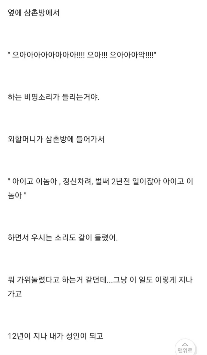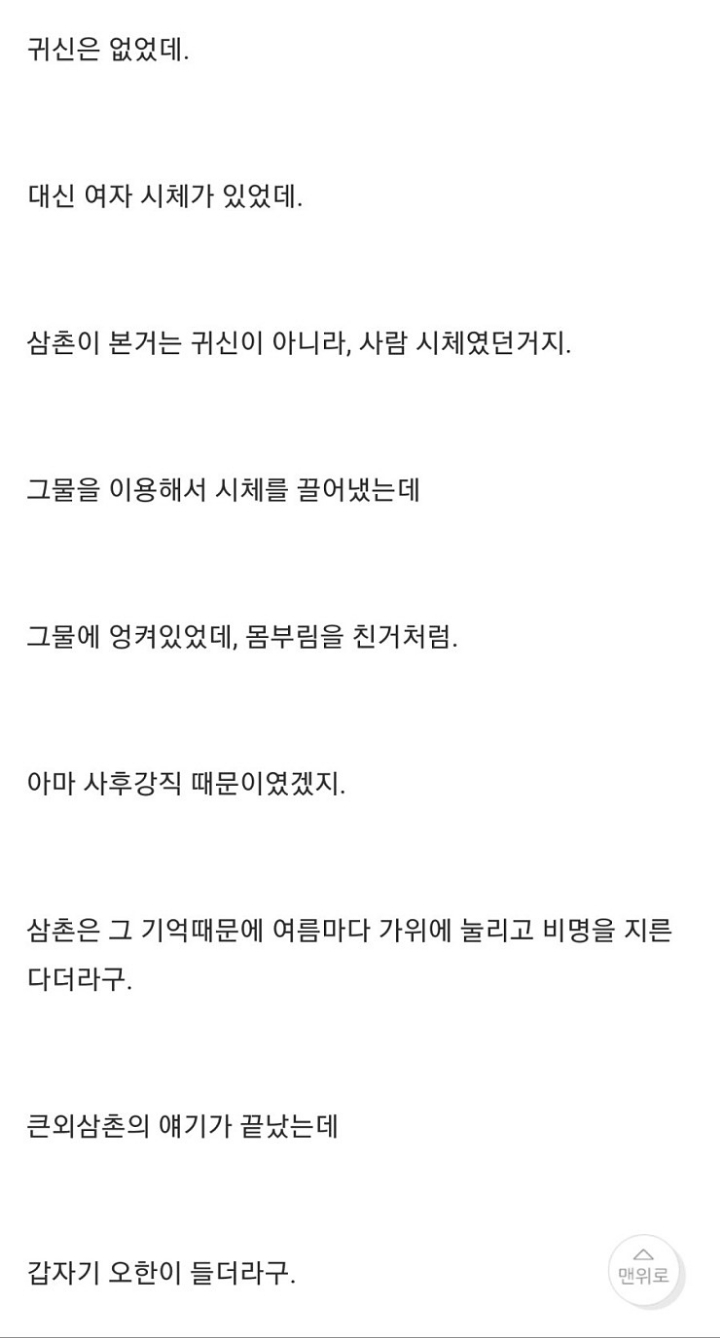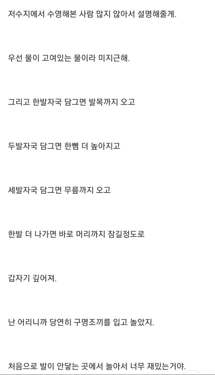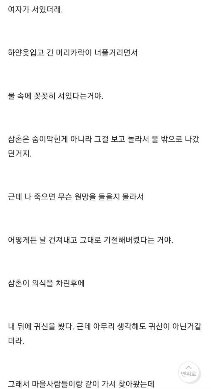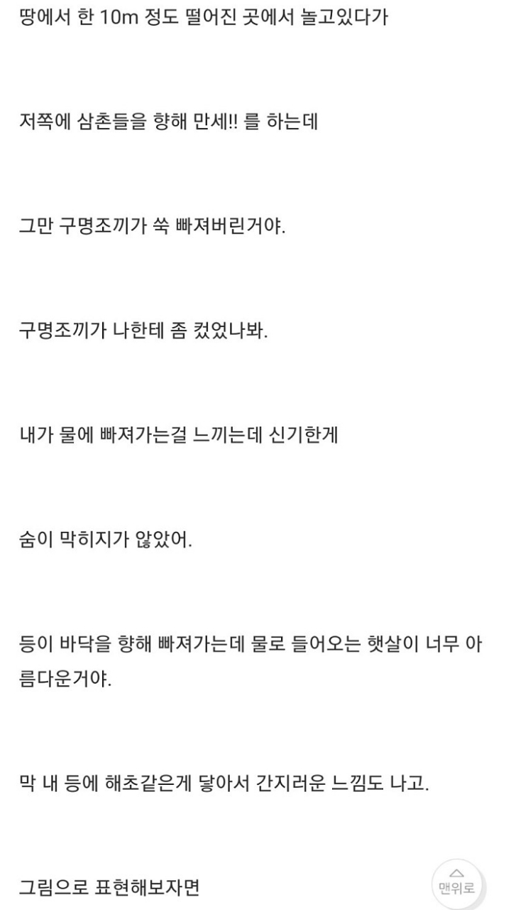 [기타]나 어렸을때 저수지에 빠진적 있거든? 근데... 작성자윤 신|작성시간22.05.19|조회수31,056 목록 댓글 22 글자크기 작게가 글자크기 크게가 출처 : http://www.todayhumor.co.kr/board/view.php?table=panic&no=50683나 어렸을때, 저수지에 빠진적이 있거든? 근데...때는 1998년 여름, 내가 6살때 일이야 여름이라 전남 담양 외삼촌네 댁으로 놀러갔었어. 수박도 먹고, 닭도먹고, 포도도.. 뭘 처먹기만 했네.www.todayhumor.co.kr 다음검색 현재 게시글 추가 기능 열기 북마크 공유하기 신고 센터로 신고 댓글 댓글 22 댓글쓰기 답글쓰기 댓글 리스트 작성자더이소 | 작성시간 25.11.03 옛날글인데 인기글이네?! 답댓글 작성자바람이 솛나솛 작성자 본인 여부 작성자 | 작성시간 25.11.03 ㄴㄷㄷㄷ3년전 글인데...?무사와요 무사와ㄱ핫플가서 조회수 올라가서 그런가부당ㅋㅋㅋㅋㄱ 답댓글 작성자스트로베리초콜릿무스 | 작성시간 25.11.03 헉스 무섭다 저는 핫플 무서운 글에서 왓어요.. 작성자새로운닉넴뭐하지 | 작성시간 25.11.03 아 너무 무섭다ㅠㅠ 삼촌 ㅠ 작성자베리a | 작성시간 25.11.04 무섭다ㅜㅠ 댓글 전체보기