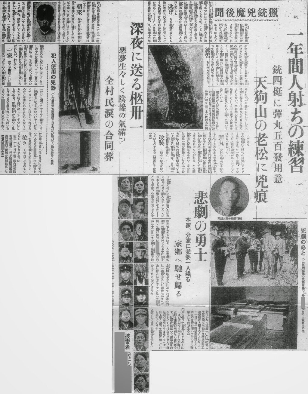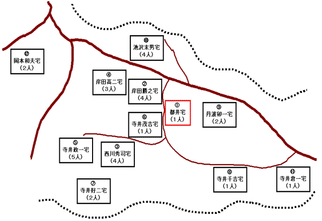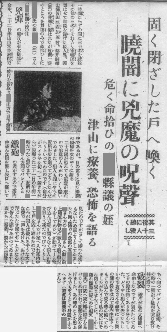 희생자 25~27 토이는 4남 아키오(5세)와 모친 츠루(72세)를 사살하고 도망치려 하던 부친 가츠이치(74세)에게 난사해 사살했다. 차남 쇼우(당시 12세)와 삼남 쇼조(당시 9세)는 토이의 눈에 띄지 않았는지 상처 하나 입지 않고 살아났다.