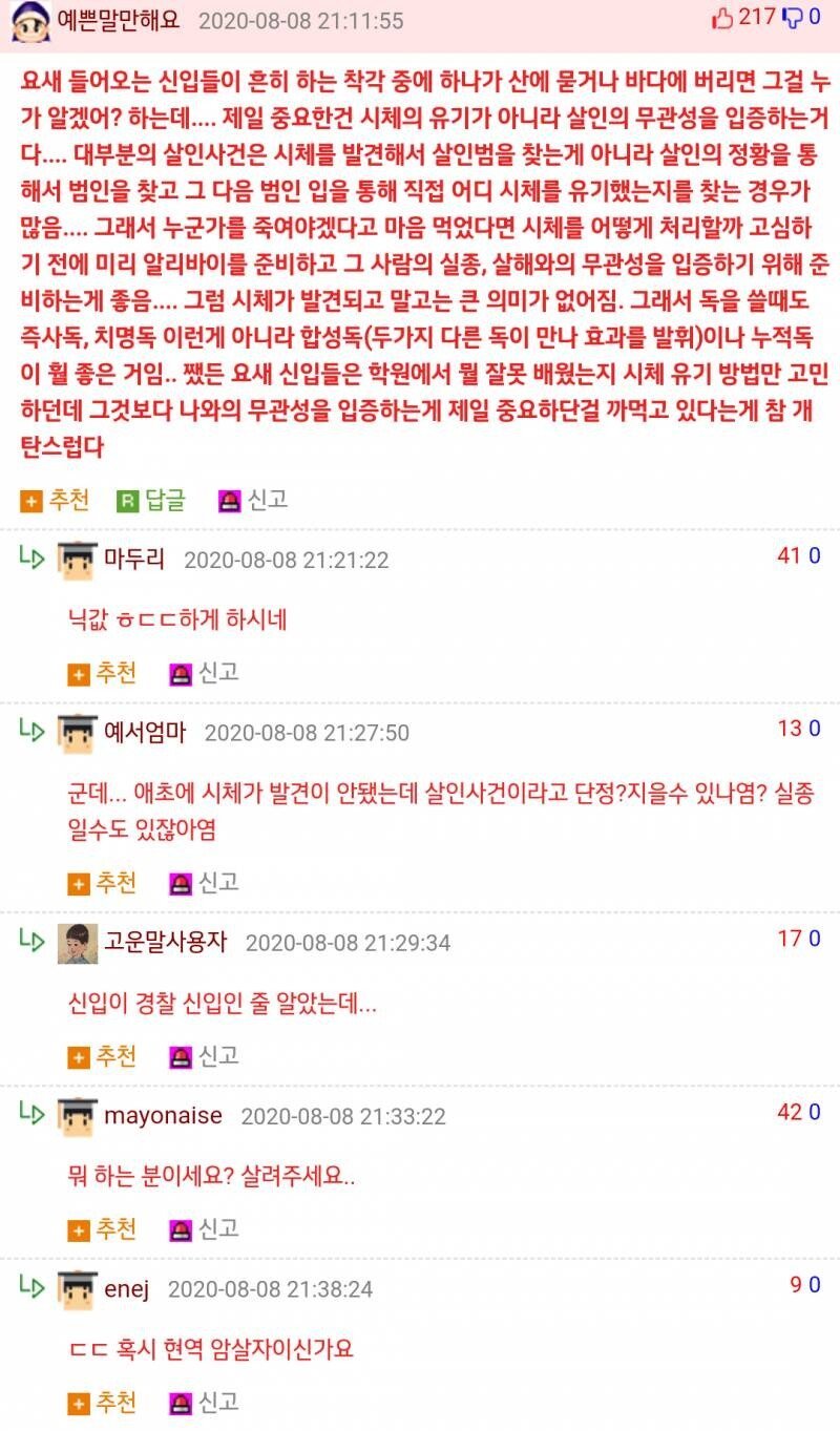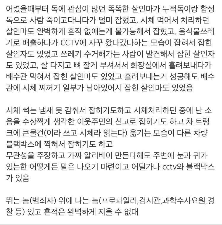 작성자동구라미라미 작성시간 24.06.19 결국 무관성입증해야되는데...쨋든 팩트는 사람을 죽이면 마지막으로 만난 사람 나 연락한 사람 나 이야기한 사람도 나가 되버리지않나? 이걸 어떻게 빠져나가....그리고 전문가들은 범죄자 엄청 만났을건데 사소한 말한마디에서 이상함을 캐치하는데...이걸 안 들킬 자신이 있다고? ㅋㅋㅋㅋ 그런 생각하는 사람은 자기 자신을 너무 대단하게 보고 있는게 아닌가 이런 생각이 듬 ㅋㅋㅋ