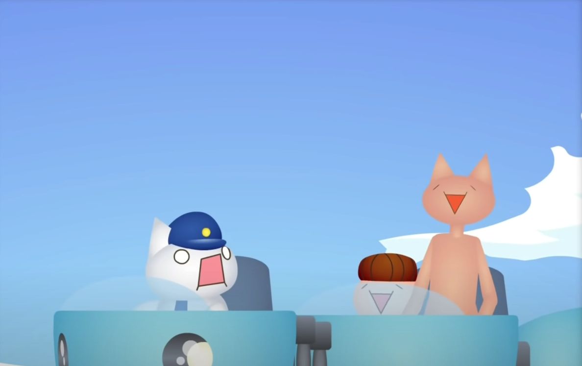 그녀는 고양이기사가 운전하는 생선처럼생긴 기차에 탑승합니다.