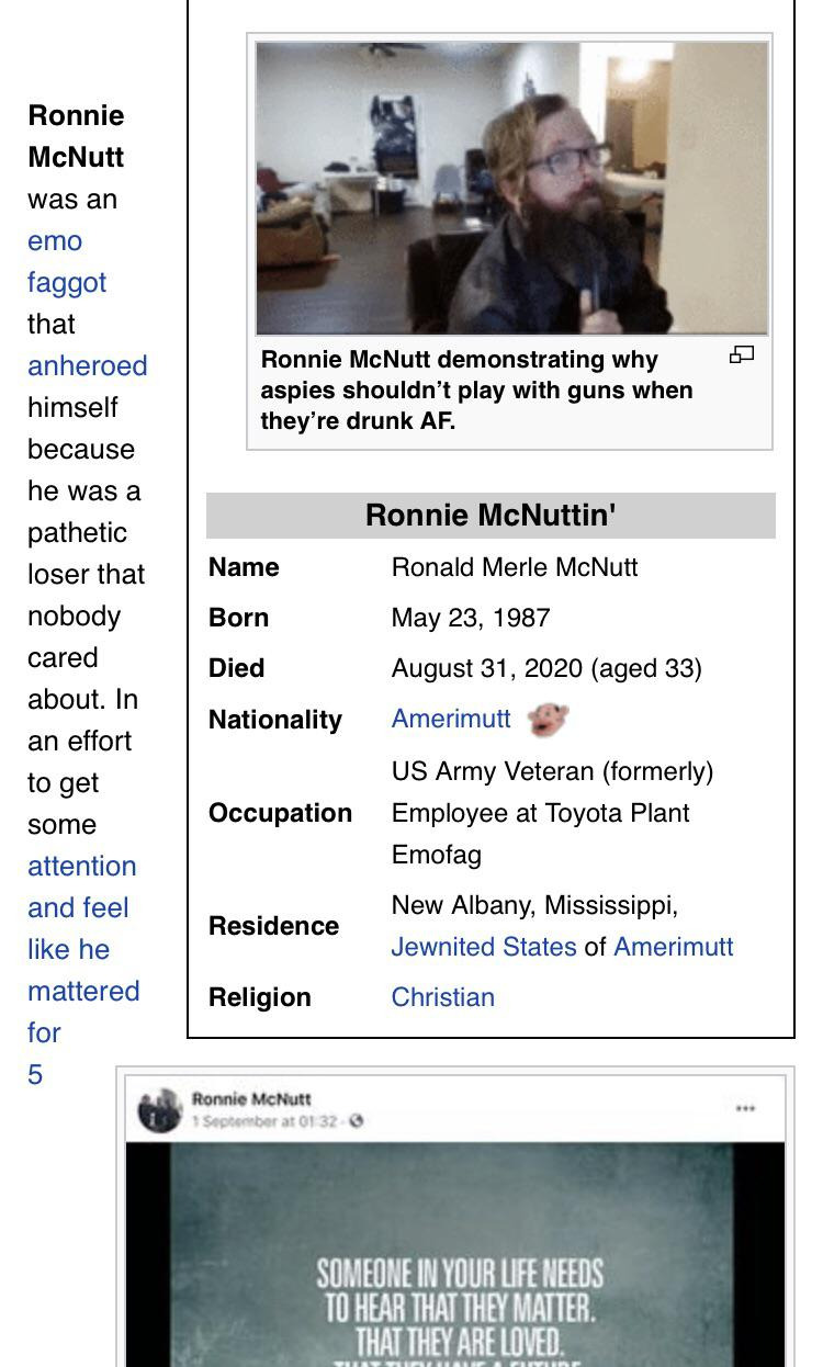 Encyclopedia Dramatica에서는 Ronnie Mcnutt(로니 맥넛) 문서에 들어가자마자 상단에 로니가 턱에 산탄총을 대고 방아쇠를 당기는 장면이 gif로 반복되고 문서 중간에 영상으로도 있다.