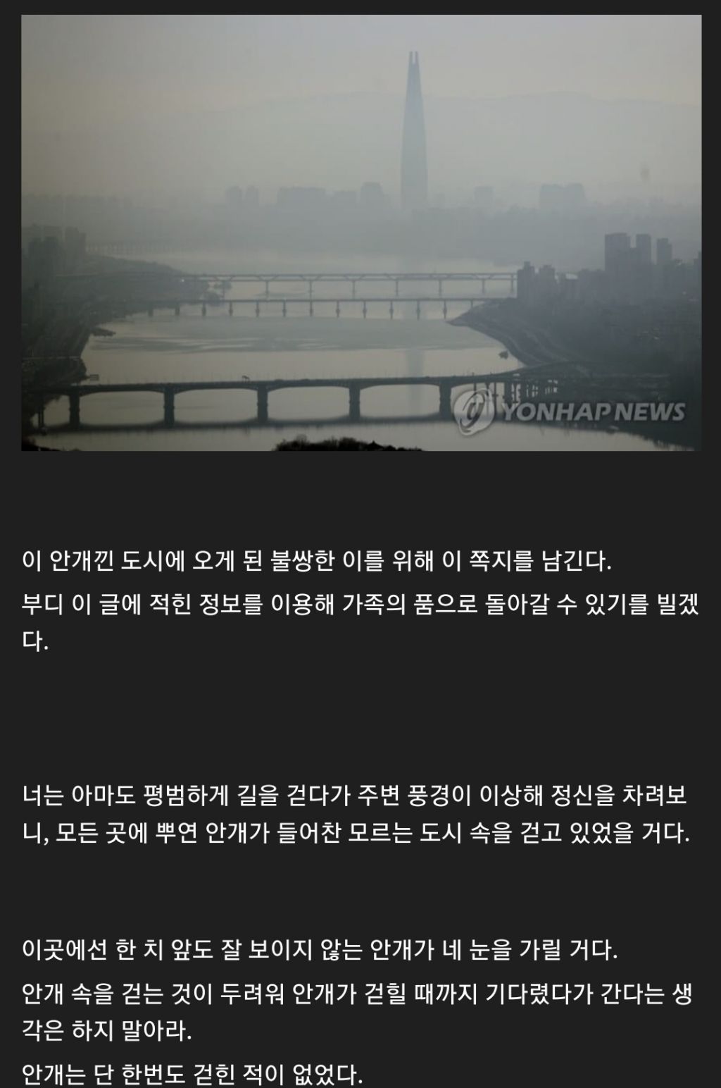 이 안개낀 도시에 오게 된 불쌍한 이를 위해 이 쪽지를 남긴다.