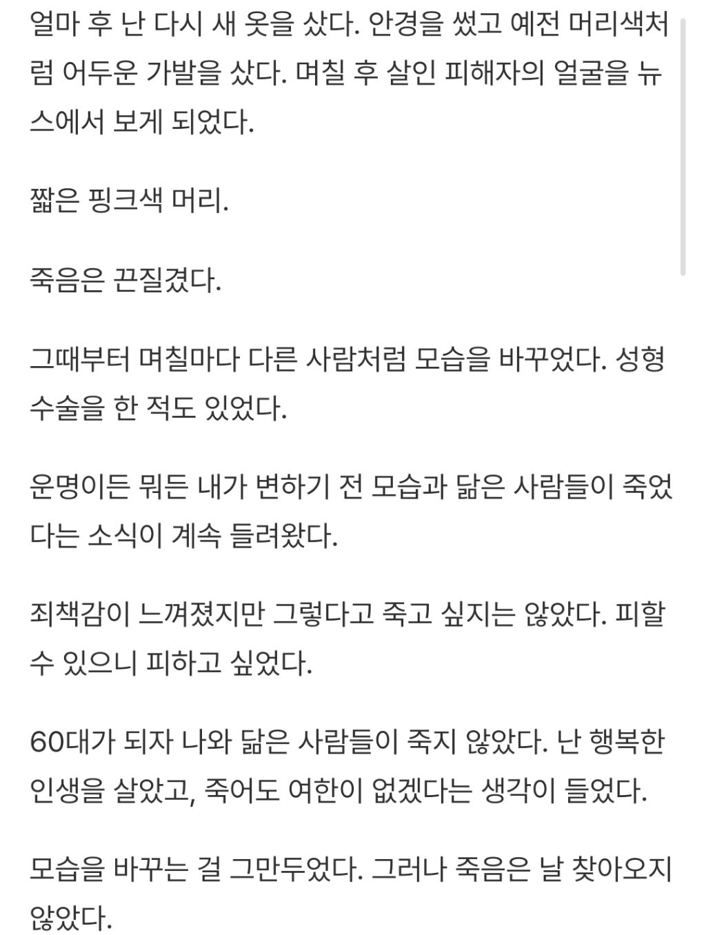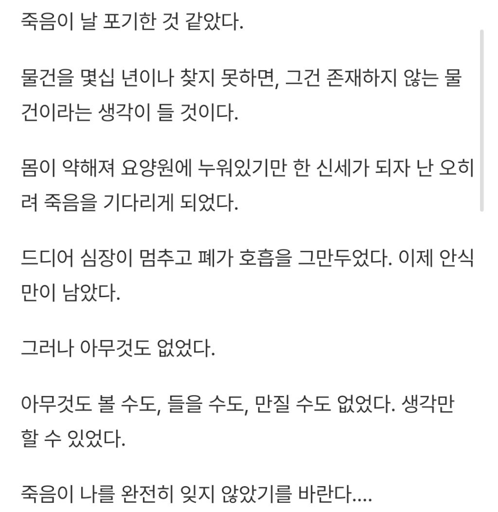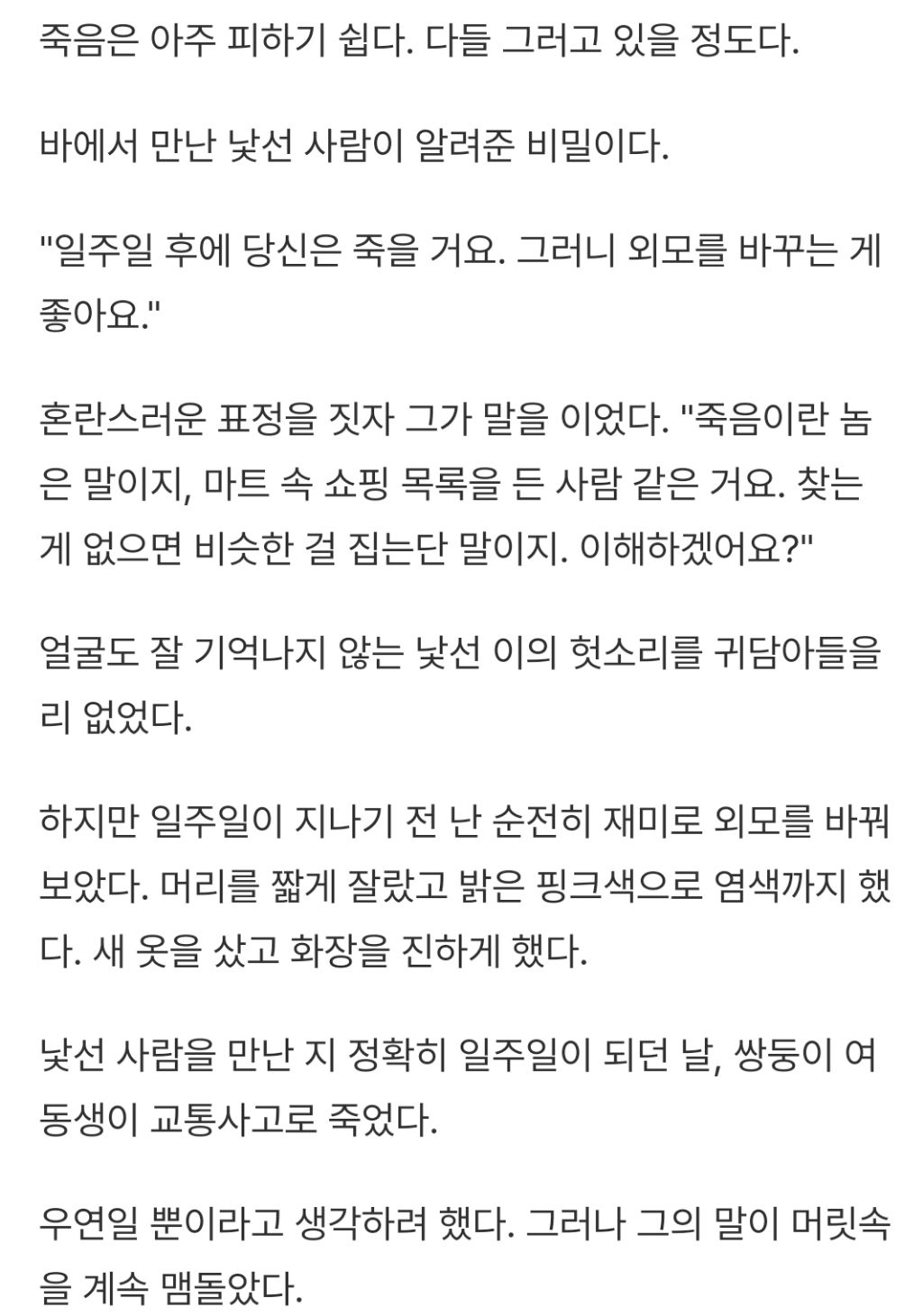 [소설]죽음을 피하는 법 작성자최형우|작성시간25.01.03|조회수10,036 목록 댓글 21 글자크기 작게가 글자크기 크게가 출처 : https://www.reddit.com/r/shortscarystories/comments/163an4a/how_to_cheat_death/?rdt=46842 다음검색 현재 게시글 추가 기능 열기 북마크 공유하기 신고 센터로 신고 댓글 댓글 21 댓글쓰기 답글쓰기 댓글 리스트 작성자ROCKET RACCOON | 작성시간 25.01.15 헉.. 작성자똥가루를날려 방구를더크게터뜨려 | 작성시간 25.01.16 와우…아니 조금피했다고 죽지도못하게하는건 아니지 작성자핑크쪼꾸미 | 작성시간 25.01.24 헐 너무 무섭다........ 작성자이만보걷기 | 작성시간 25.03.11 오 재밌다 작성자분홍박스칸쵸 | 작성시간 25.08.12 누락됐어요 ㄷㄷㅠ 재밌다 ㅋㅋㅋㅋ 댓글 전체보기