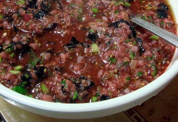 간장·깨소금·후추·마늘·파·설탕·계란 노른자·식초·기름을 넣고 범벅을 한 것이다.