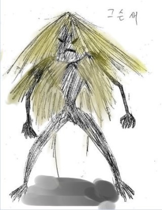 등이 있어 영노만의 특징이라 한다면 뭐든지 다 잘먹어 빠수니라서 창민이 생각남ㅋㅋㅋㅋㅋㅋㅋㅋㅋㅋㅋㅋㅋㅋㅋ.......미안 맞다 영노는 특이한게 서적이나 구비문화로 내려오지 않고 가면무(탈춤)로 이어져왔고 이무기친척이지만 백성들을 대변하거나 대표하면서 이무기와 달리 백성들에게 이미지가 굉장히 좋았다고 해 영노 매덩이구나 쥐새끼도 먹니?네가 필요해 3)그슨새 짚으로 된 주젱이(빗물이 스며들지않도록 낟가리위에 덮는 것)우장이나 도롱이를 닮았다고 전해지는 제주도의 토박이 요괴로써 여타 다른 요괴들과는 달리 주로 낮에 활동하는 개성적(?)인 요괴라고해 그슨새는 우장을 닮았다는 재미있는 설정과는 달리, 혼자있는 사람을 홀려서 죽이기도 한다고 해 호전적인 성격으로써 물불 안가리고 달려들기도 하고 어떤 이 생각으로써는 귀신이나 괴물을 나타내던 말인 그슨대(물론 그슨대라는 이름의 요괴도 있다고 해)가 제주도에서 변형된 말로 보기로 해 사실 제주도에 귀신이나 요괴혹은 신에 관련된 민담이나 설화가 매우 많음 섬이라 그릉가........? [출처] [한국의 전통 괴물] 4. 그슨새|작성자 화난고양이 4)두억시니 (사진은 도깨비장군이라능) 두억(거칠고 우악스럽다)과 시니(귀신을 뜻하는 우리옛말. 한자어로 신위(神位)를 뜻한다.)를 결합한 이름이야 이렇게 옛말이 등장할만큼 두억시니의 역사는 엄청나게 길어 그 기원은 고조선으로 까지 거슬러 올라가